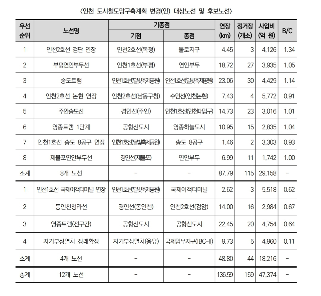 B/C값도 1이상이고 전체 순환에서 1단계로 반토막 냈는데도 우선순위는 6위다. 사업비가 높더라도 인천시는 전체적으로 구도심 활성화를 목표로 하는거 같다. 솔직히 인천시 내에서 젤 필요한 곳이 영종일거 같다. 내부 버스노선은 꽤 폐지되겠지만 트램으로 주요거주지역 지나면서 공항철도까지 이어주므로 대다수 주민이 이용할 것 같고 관광지로서도 우수해보이기 때문이다.