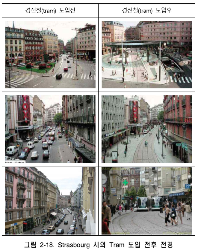 프랑스 리옹 : 단순 교통수단을 넘어 건축물과 조화를 이루도록 함. 시내 중심 6차선 도로를 2차선으로 줄임