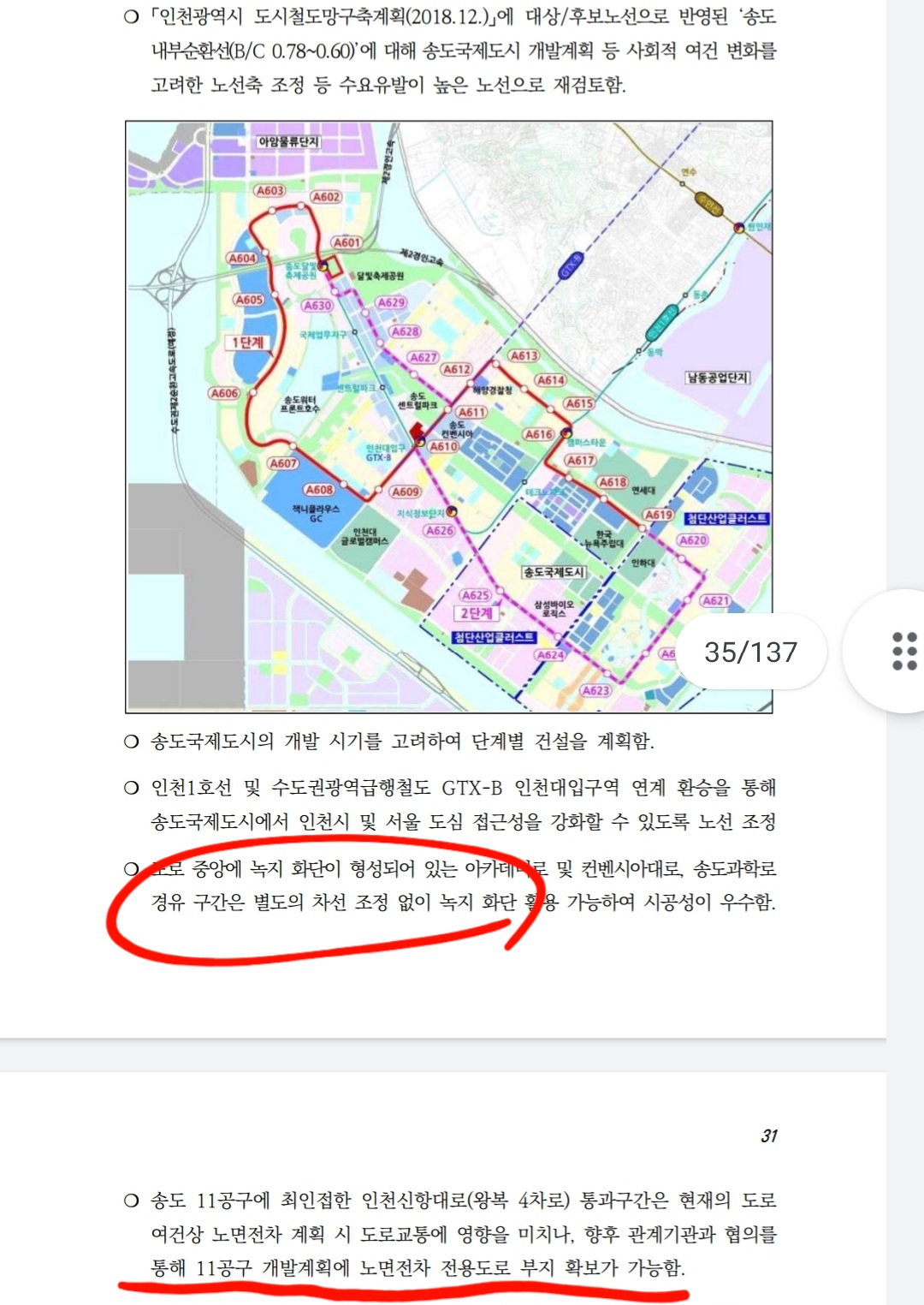 차로가 어렵다면 고가나 지하로도 다닐 수 있는데 송도는 그럴 필요는 없을 것 같고 사업비 산출 시 고가나 지하는 반영되지 않았던 것으로 보인다.(경기도 자체 보고서에는 지하나 고가가 있다면 사업비 별도 산정하였으나 송도 트램에서는 볼 수 없었음)