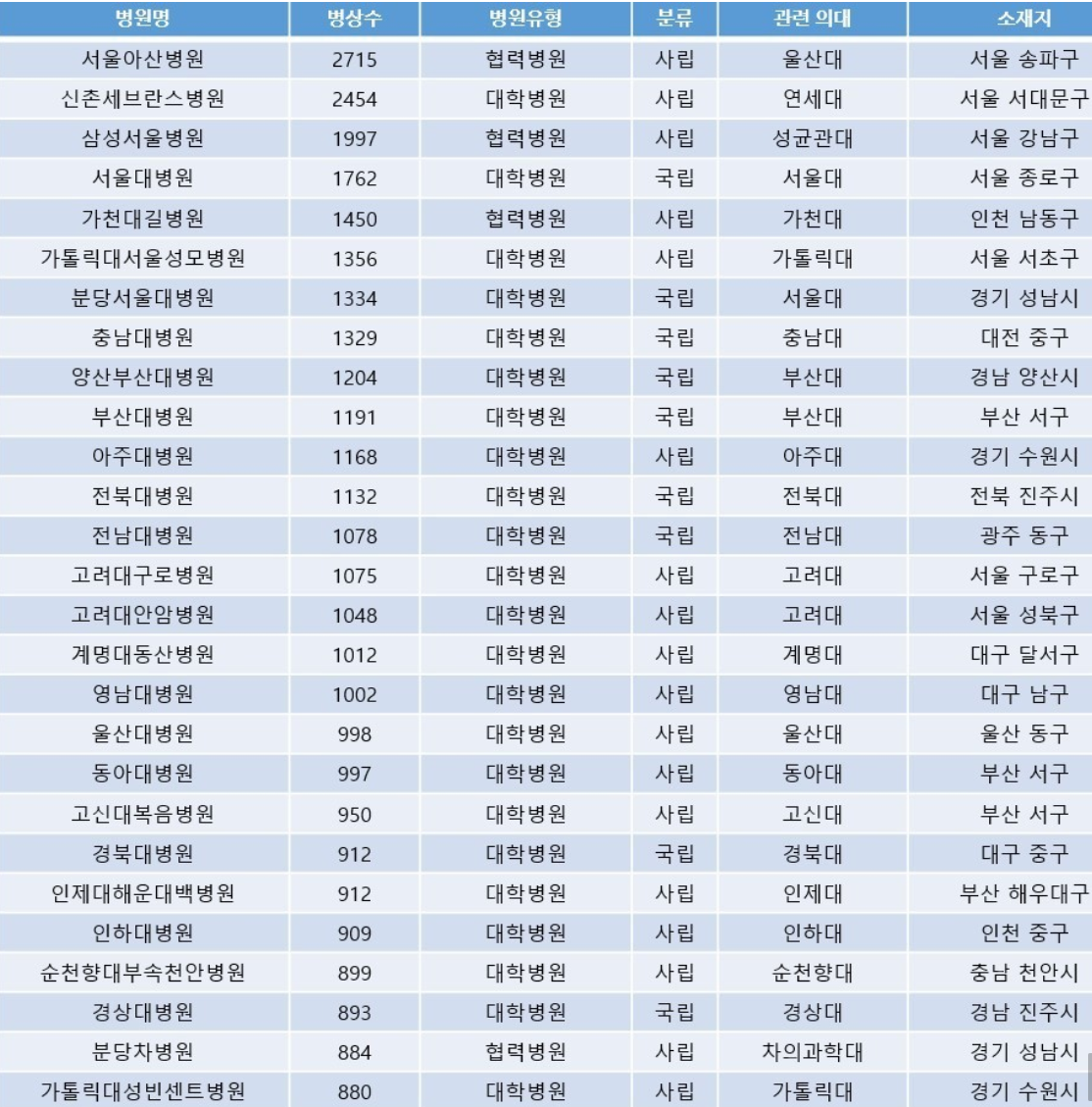 국내 병상수 기준 병원 순위를 보면 서울아산병원, 신촌세브란스 병원이 부동의 1,2위이며 삼성서울병원과 서울대병원이 뒤를 잇고 있다.