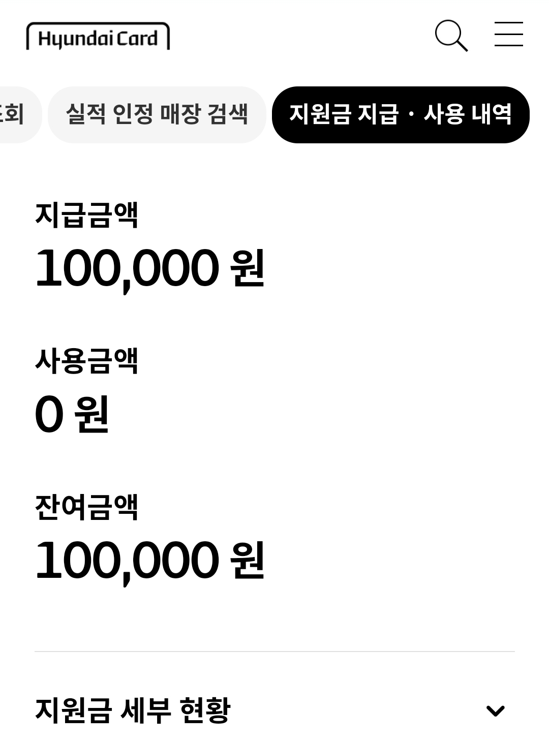저는 현대카드에서 신청했기 때문에 현대카드로 지급되었고 지급받은 지원금(포인트)은 카드 사용 시 우선 차감된다고 합니다.