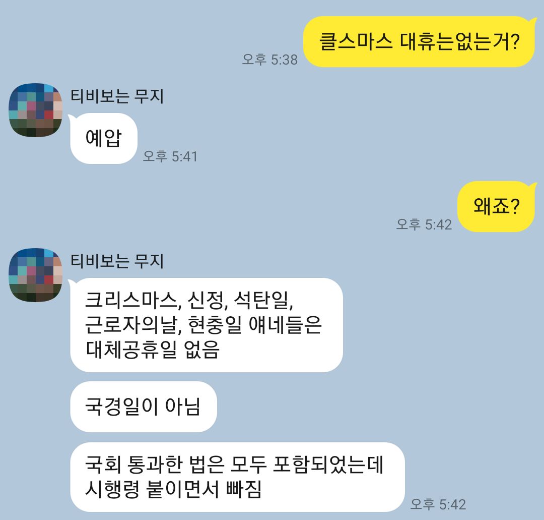 12월 일정을 보다보니 크리스마스는 주말인데 그럼 10월3일(일요일) 개천절처럼 대체공휴일이 있어야 하는데 없는거다.