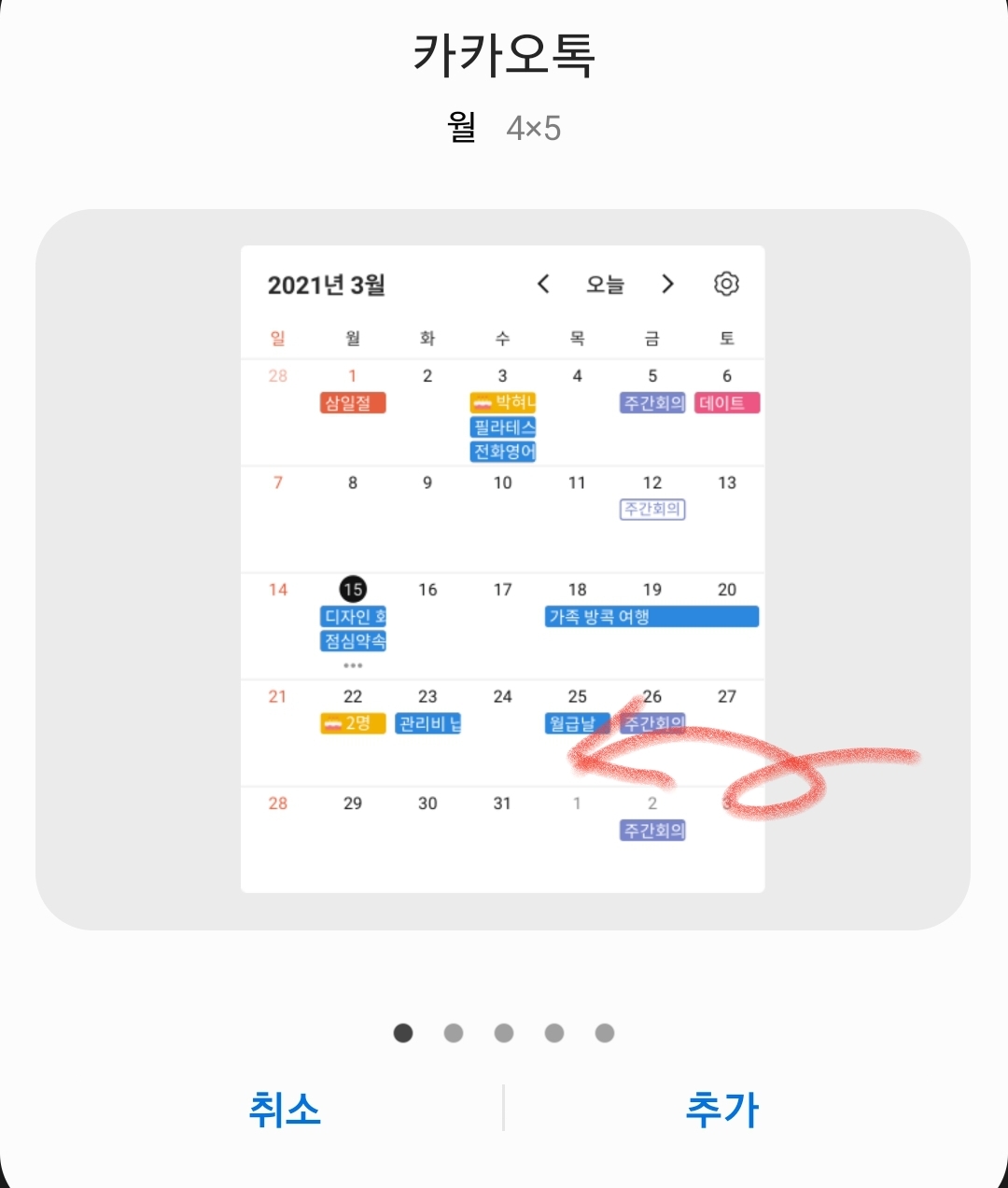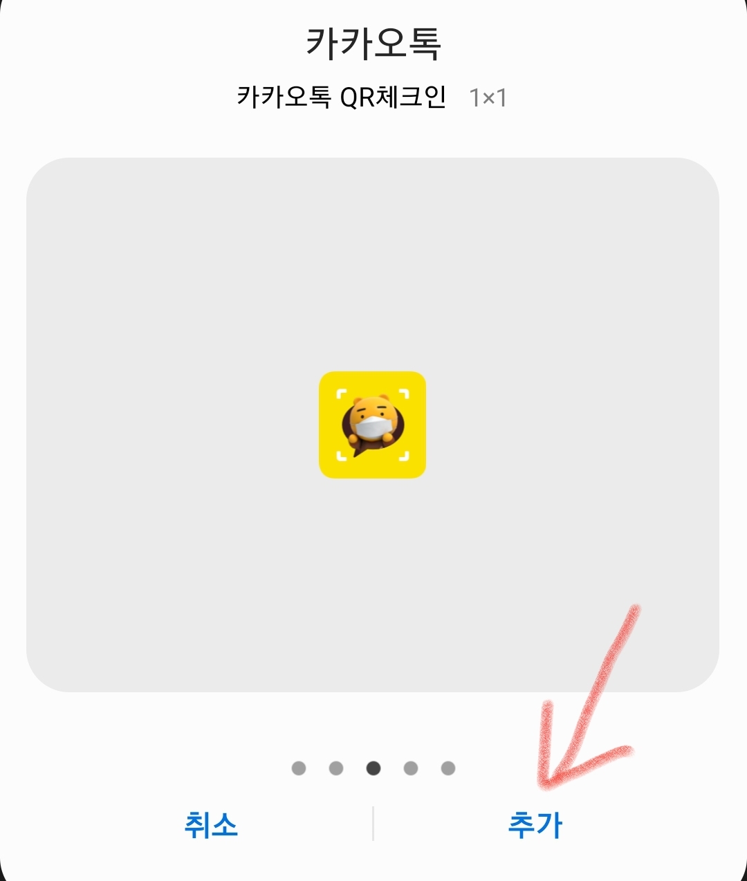 3. 카카오톡 위젯 내에서 화면 3번정도 넘기면 마스크 쓴 카카오톡 캐릭터가 있는데 '추가'를 눌러줍니다.