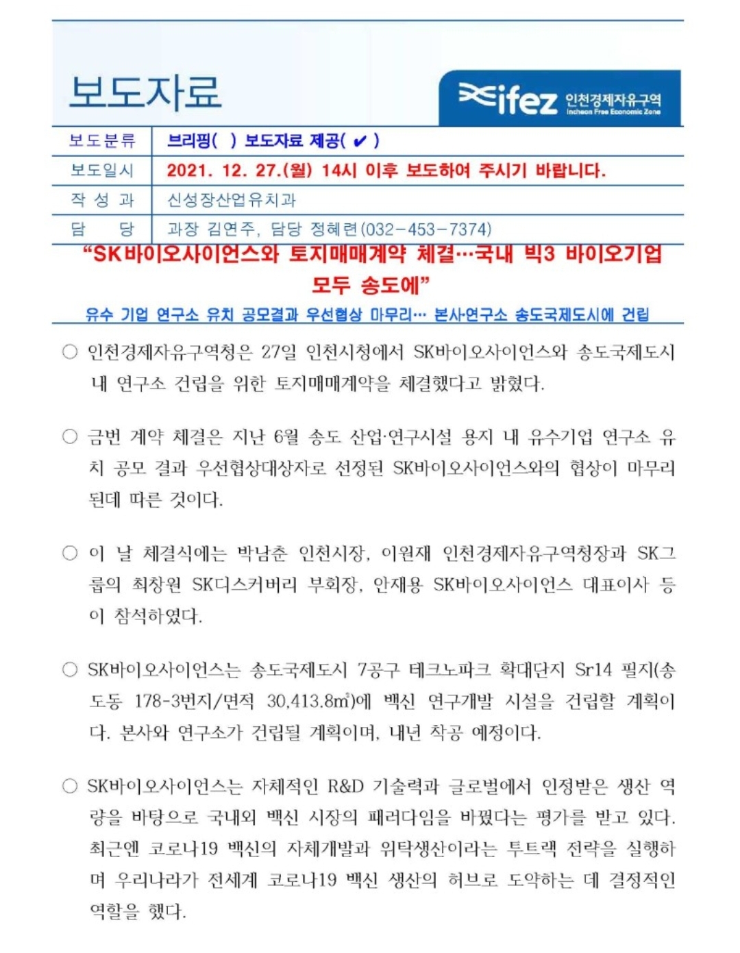 SK바이오사이언스가 인천 송도국제도시로 이전하기 위해 오는 27일 인천경제자유구역청과 토지 매매 협약을 체결한다. 국산 1호 코로나19 백신 개발을 추진하고 있는 SK바이오사이언스..