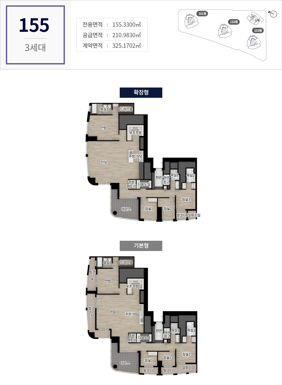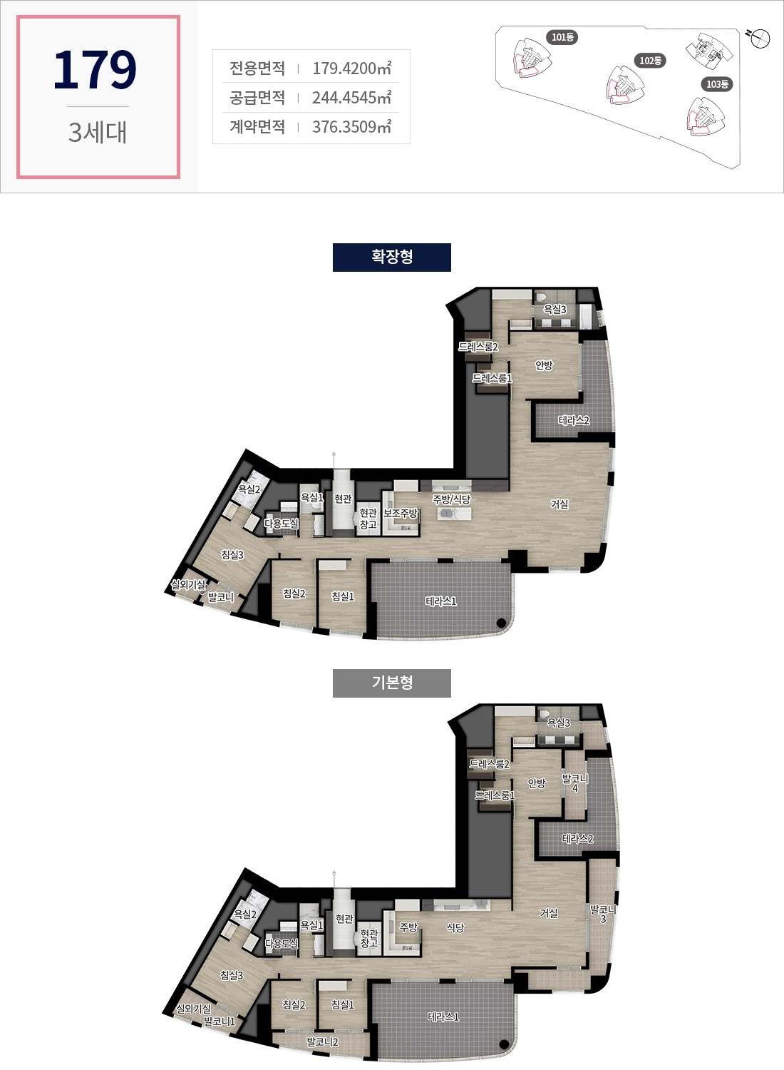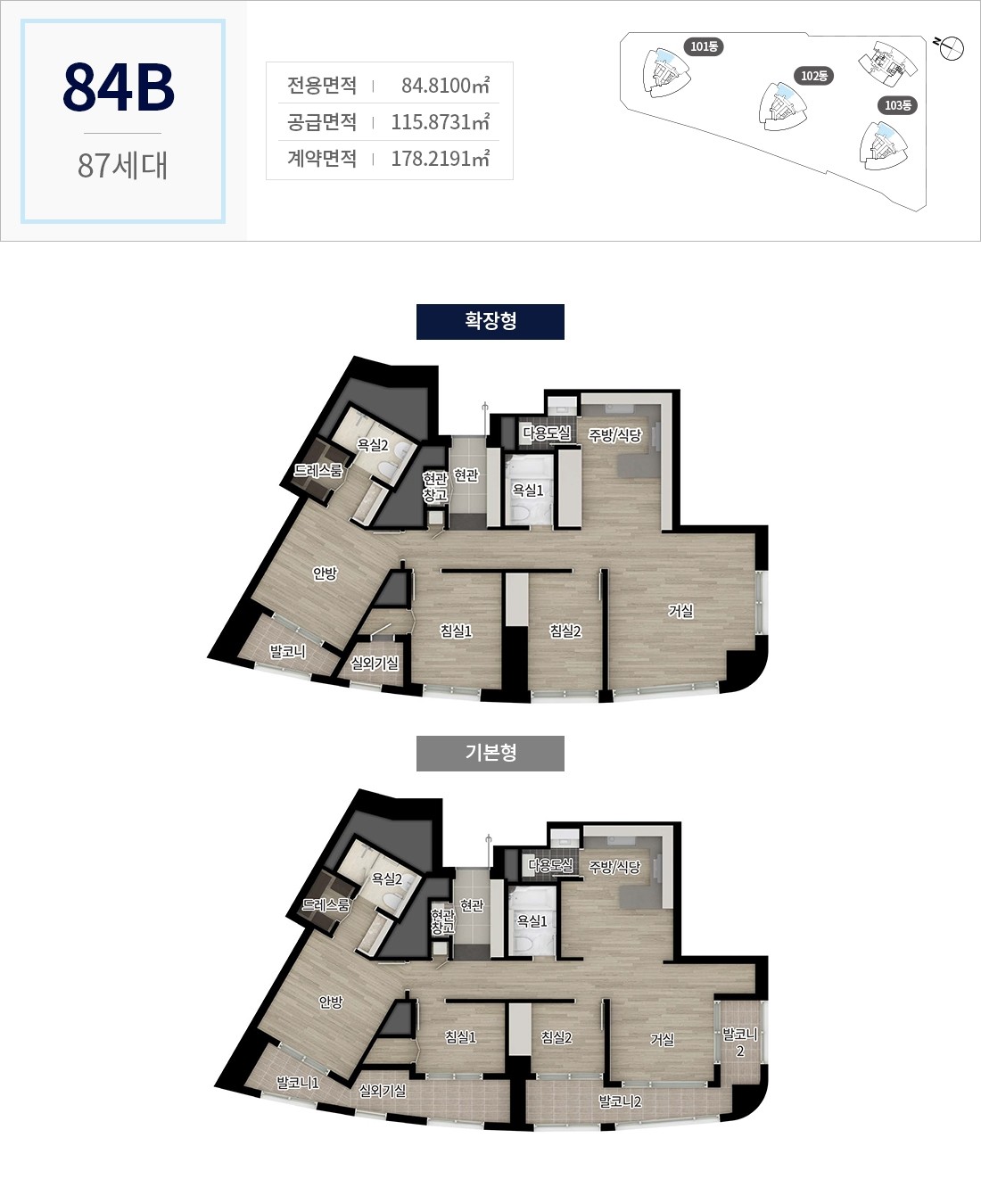 84A는 워터프론트 사이 조망이 나올 것 같은데 서비스 면적이 적어서 좁은느낌은 피할 수 없다.