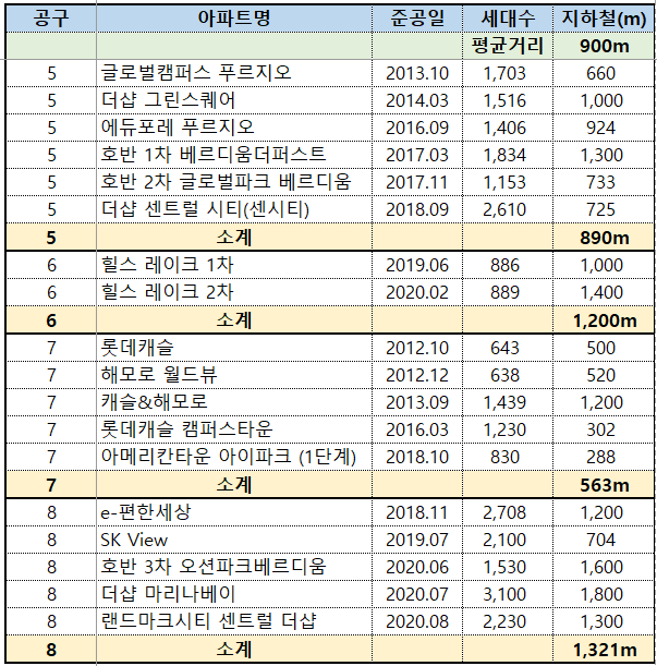 분양권 포함한 아파트별 지하철까지 거리 순위 정리 * 호갱노노 데이터를 기본으로 했고 데이터 없는 곳은 네이버 참조. 데이터 이상한 곳은 지도에서 직접 측정함 특징 - 지하철까지 가장 짧은