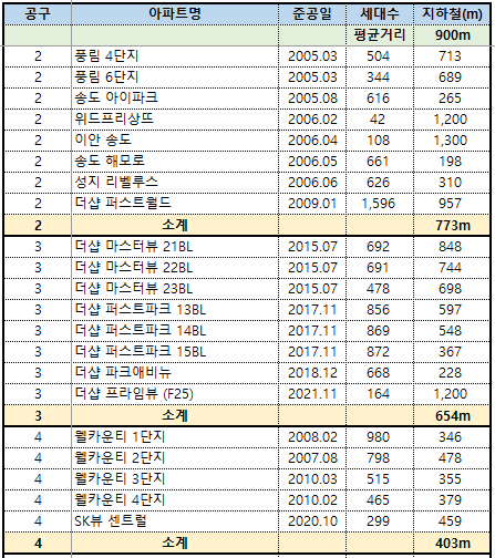 송도 아파트의 지하철까지의 평균거리는 900m
