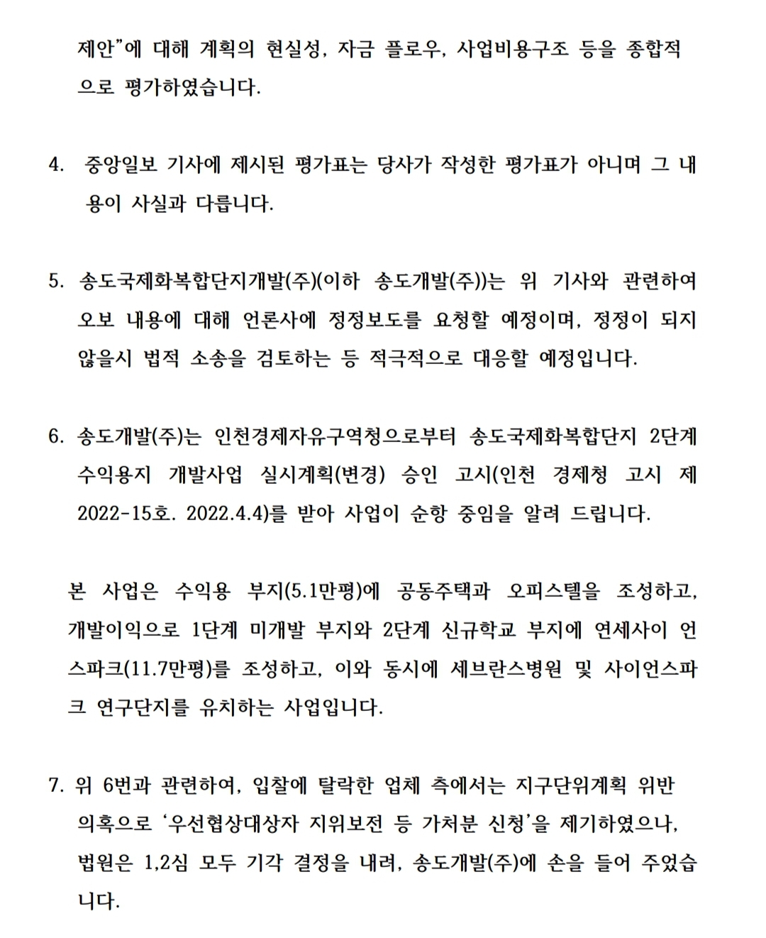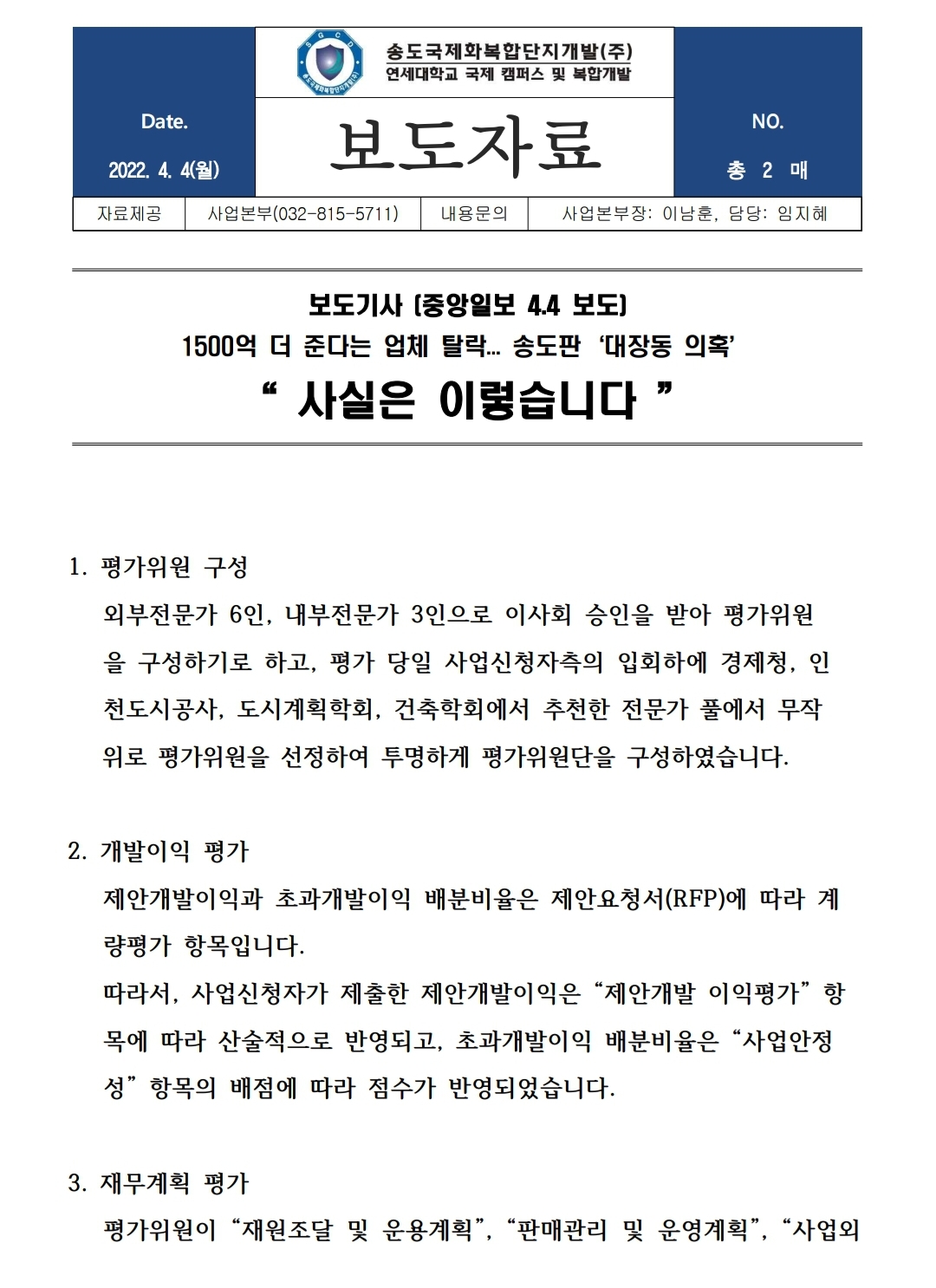 송도국제화복합개발(주) 측에서 바로 반박 보도자료를 냈다.