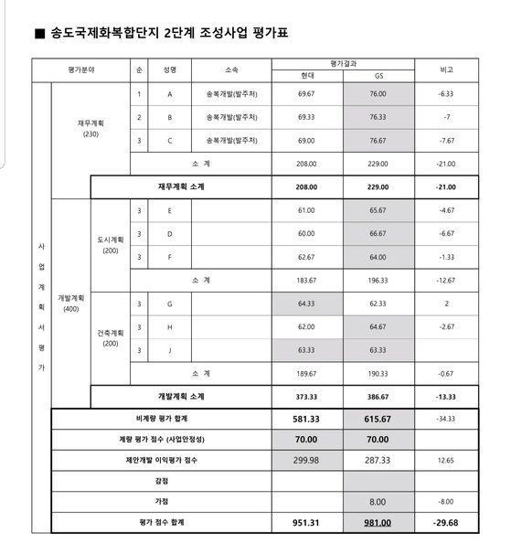 요약하면 개발계획은 gs와 현대컨소의 차이는 별로 없는데 재무상태가 좋은 현대컨소보다 gs컨소시엄의 재무 점수가 높고(7점) 현대 컨소시엄이 초과이익을 더 보장했는데 탈락했다는 것이다.