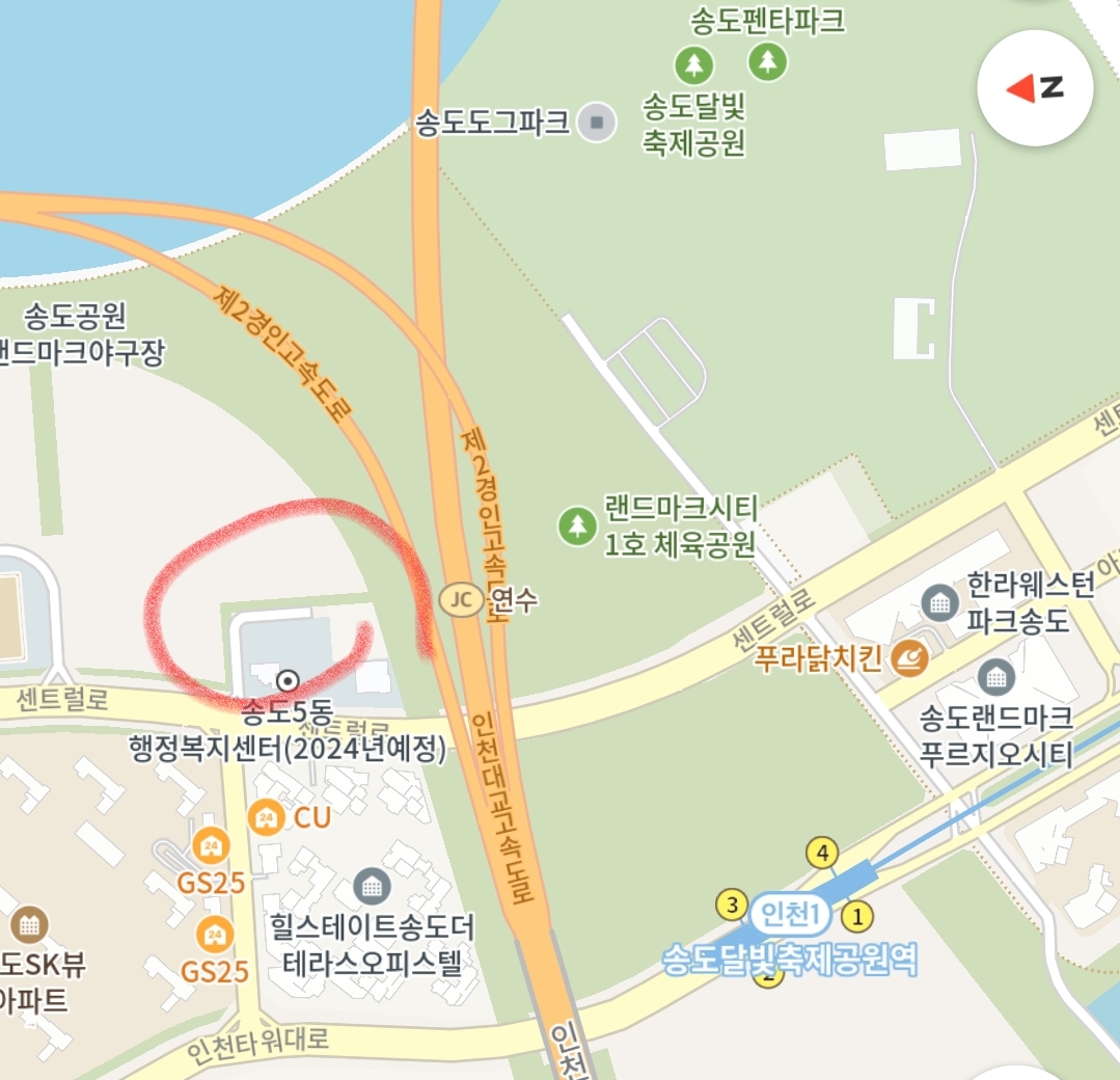 지도에서 붉은색 표시한 행정복지센터 위치인데 네비에는 안나오므로 송도sk뷰 후문이나 gs편의점 검색 후 도착하는곳 인근이다.