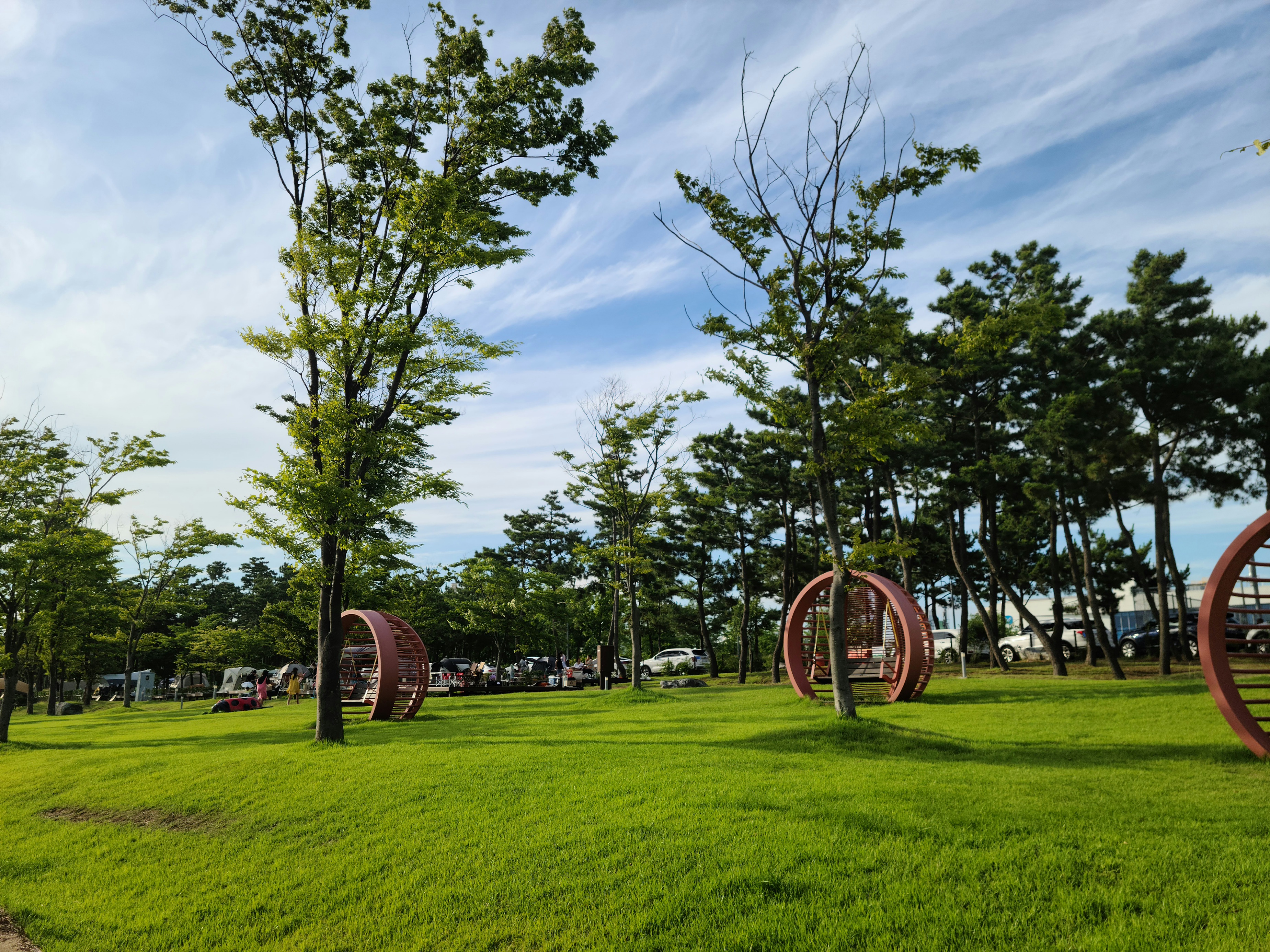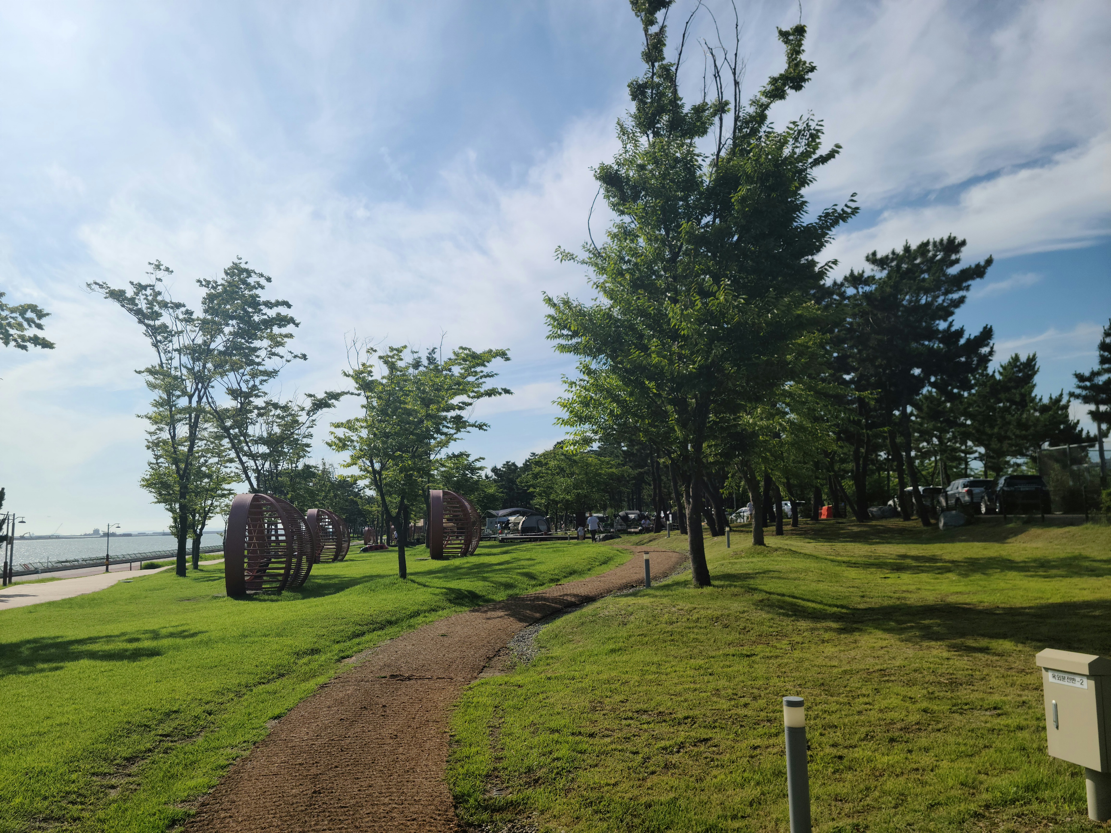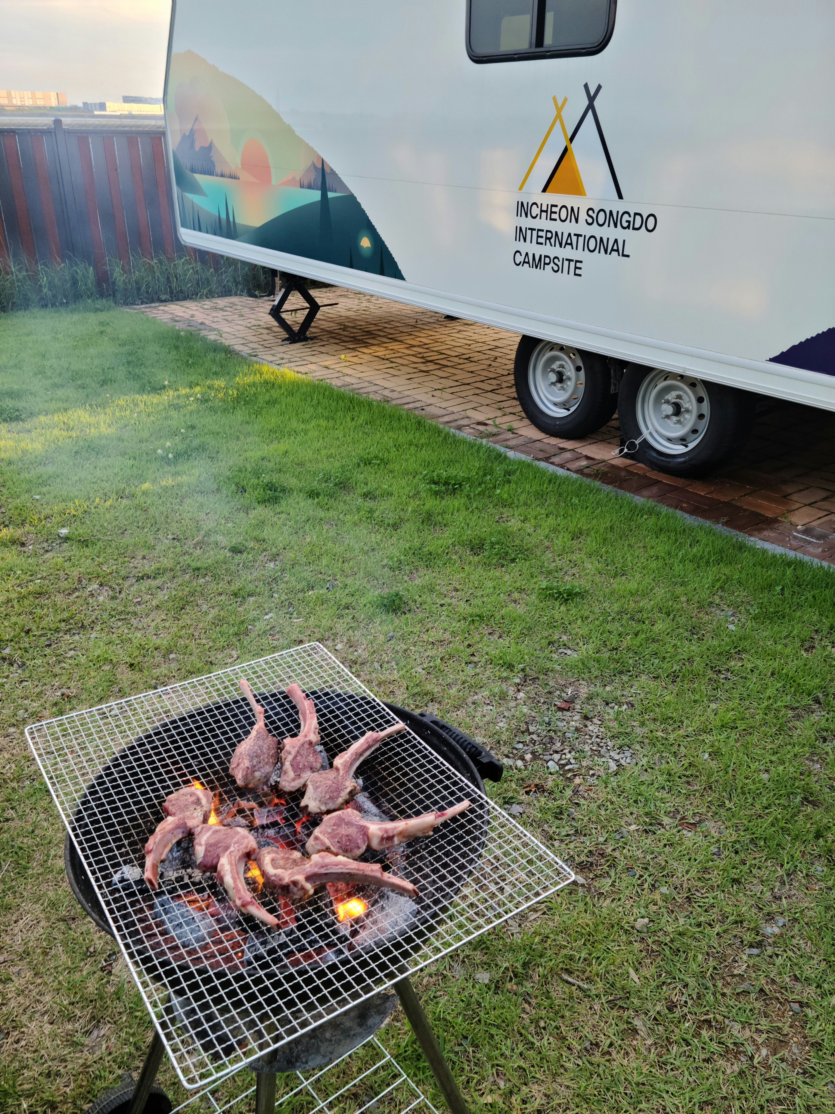 새거 느낌은 났는데 첫인상은 좋았으나 구석구석보면 먼지가 있긴하다. 카라반 옆에 넓은 잔디밭과 테이블, 정돈된 나무한그루가 있어서 운치가 있었고 카라반 앞으로 나무울타리, 그 앞에는 산책길 및 바다가 있다. 카라반은 캠피장 입구 근처고 놀이터 및 공용 화장실, 샤워실, 개수대 및 잔디밭, 산책길이 있는 최상의 입지이기도 하다. 고기 구우면서 식사도 하고 노을질 때쯤 잠깐 산책길 가서 노을지는 바다를 배경으로 사진을 찍기도 했다.
