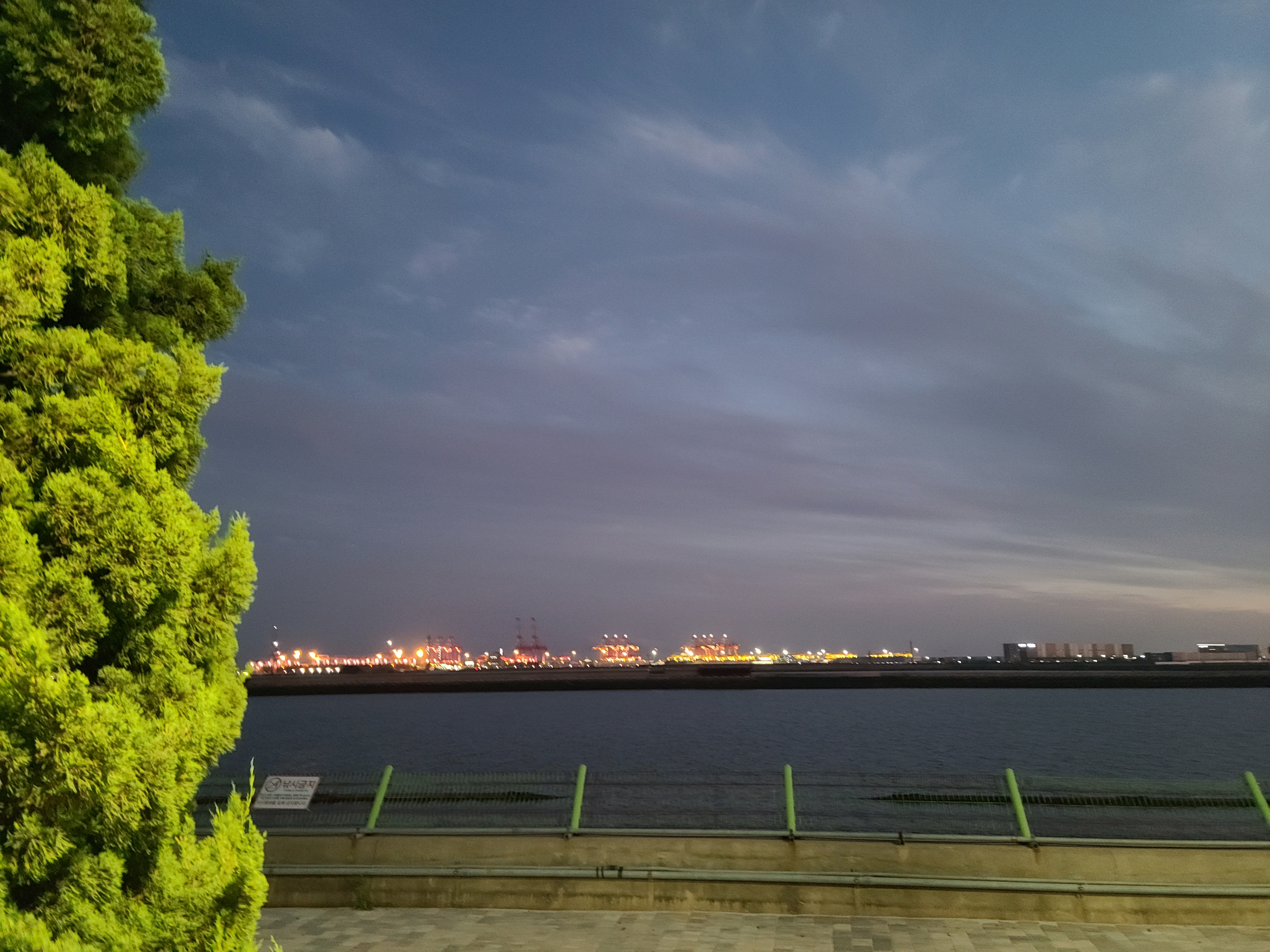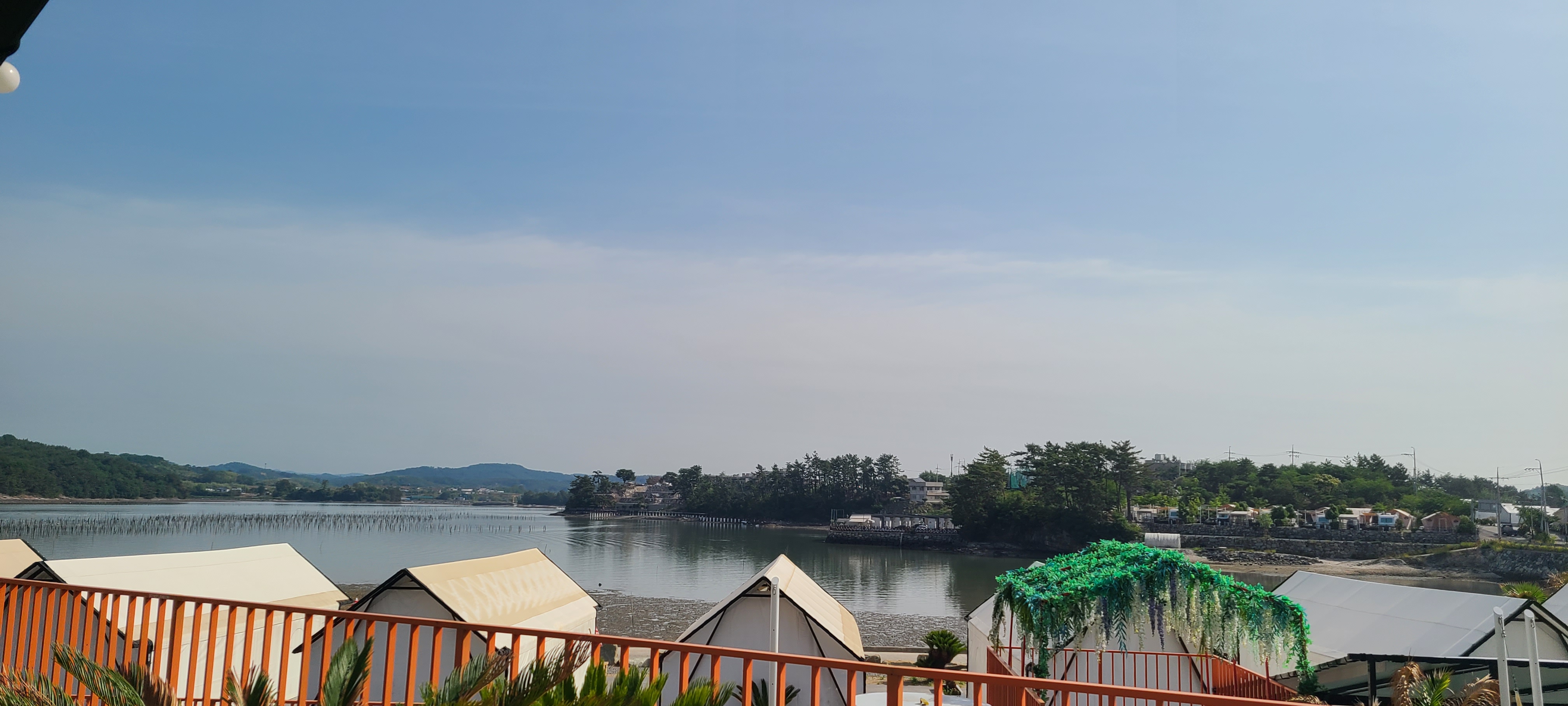 캠핑장 앞에 넓은 수로(바다)가 있고 건너편에 신항 크레인 뷰가 나옴