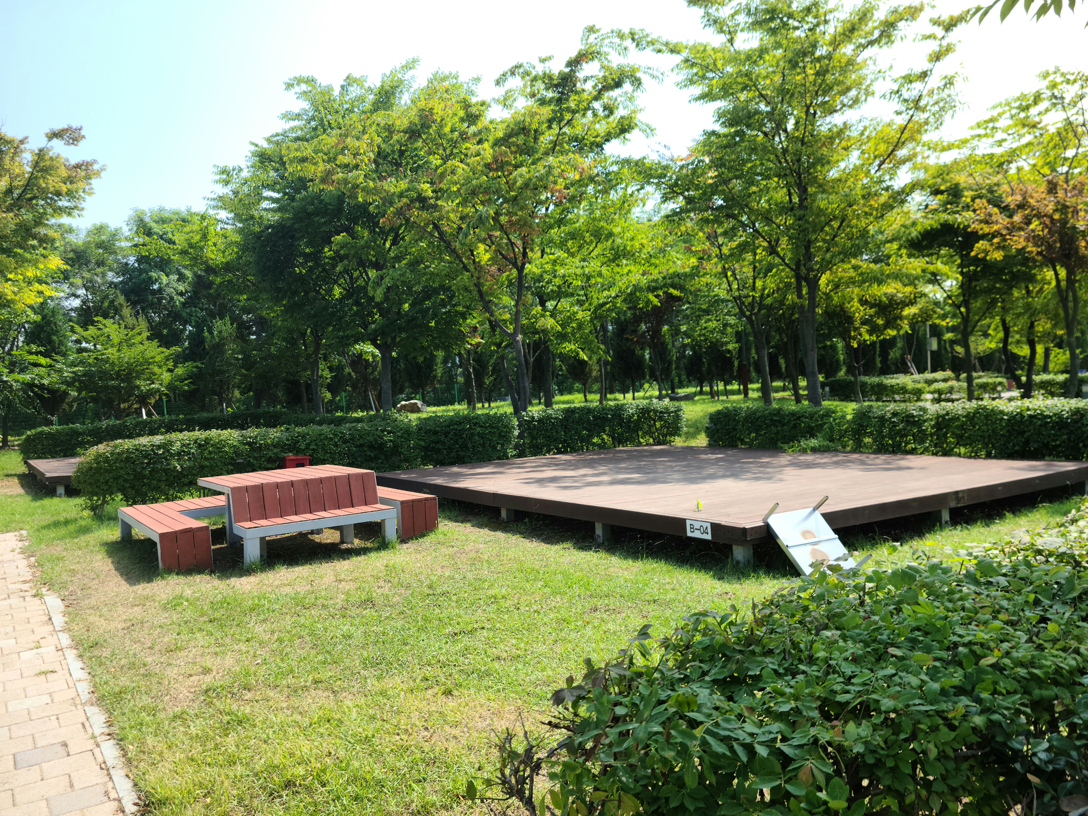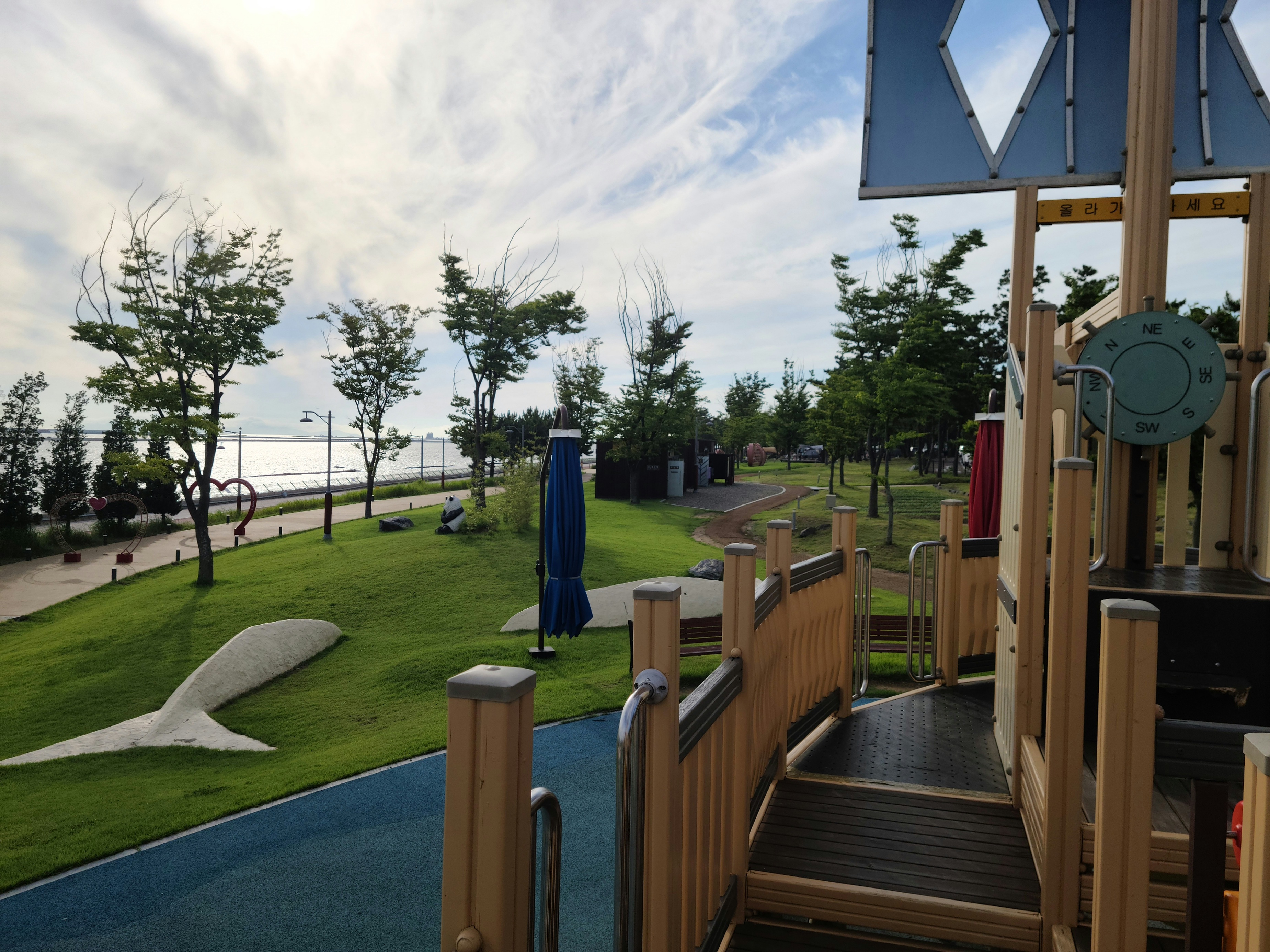 A데크 주변은 잔디밭과 조경, 벤치 등이 잘되어 있다. 동물모형 등도 여기저기 있어서 아이들이 놀기에는 A데크 주변이 좋아보였다. 데크 크기도 적당해 보임