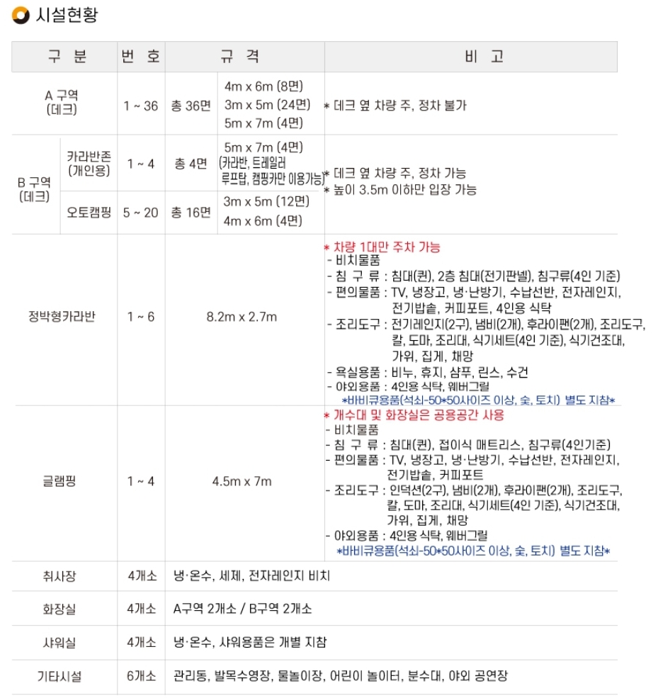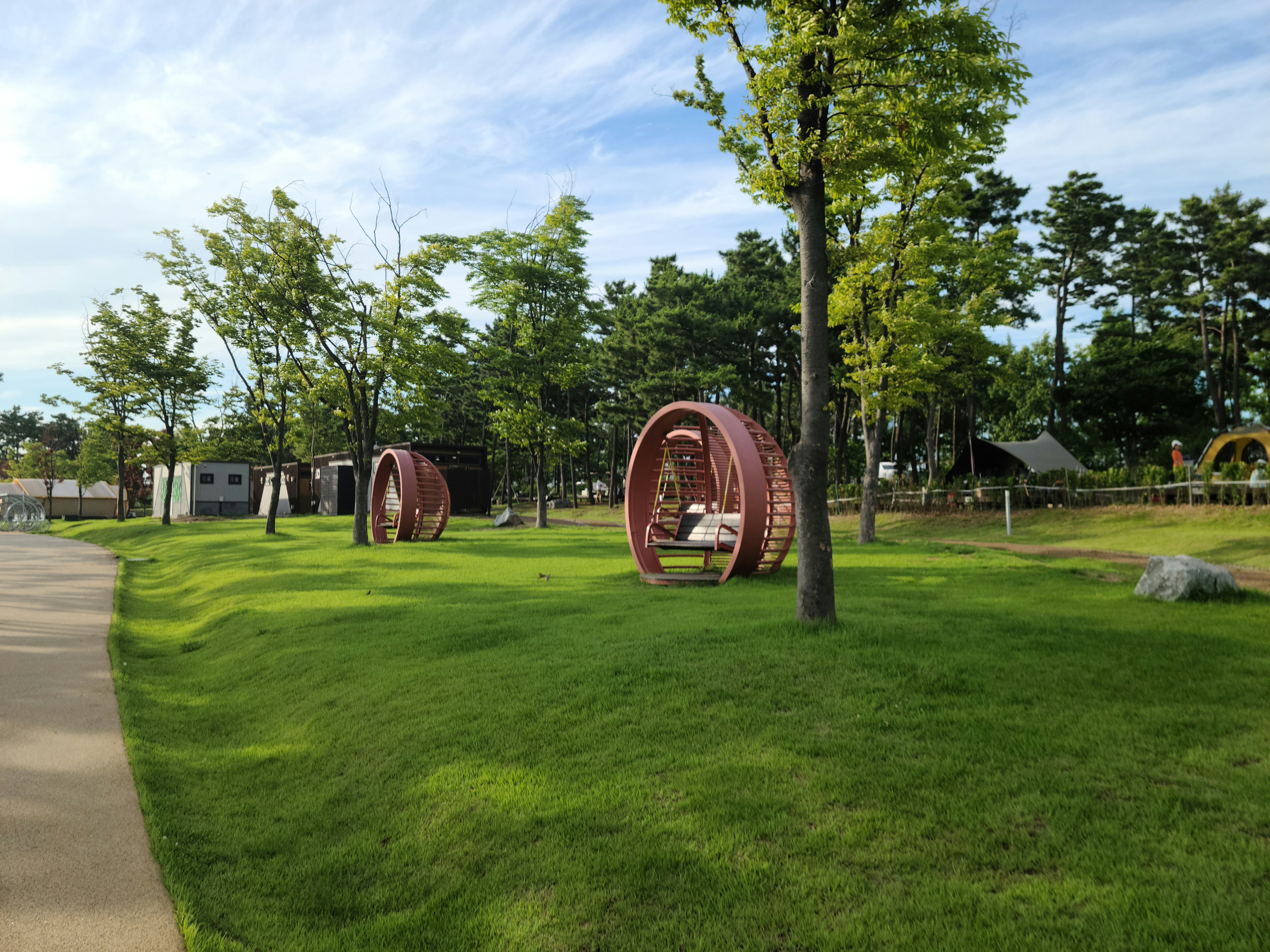 글램핑은 크기가 큰편이며 간격이 넓고 사이에 전용 쉼터 같은 곳이 있어서 상당히 좋아보였다. 다른 사설 글램핑장은 간격이 너무 좁아서 옆집 소리가 다 들렸는데 여기는 그럴 걱정은 없어보였다. 여기도 이번에 리모델링하면서 추가된거라 상태도 좋아보였다. 다만 A구역 가장 끝에 있으므로 입구에서 멀고 수영장까지도 한참 걸어야 한다.