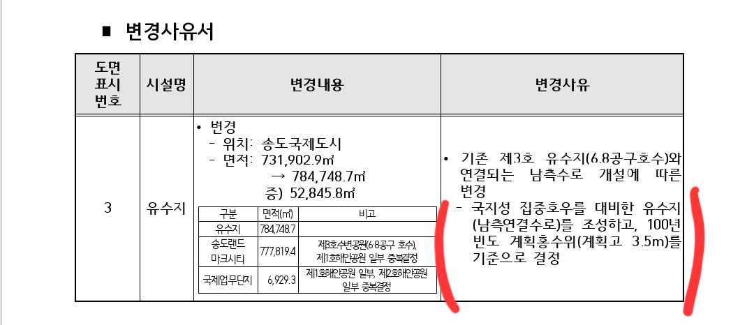 송도 실시계획 변경 내용 등의 공문서에서도 국지성 집중호우를 대비한 유수지를 조성하고 100년 빈도 계획 홍수위는 3.5m를 기준으로 설정하였다.