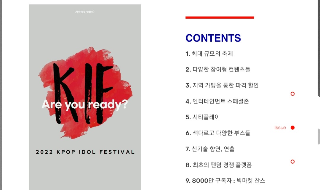 글자 그대로 케이팝 아이돌 페스티벌로서 국내 최대 규모로 기획되었으며 아이돌의 무대 공연과 관람객 대상 참여형 콘텐츠, 엔터테인먼트 스페셜존, 축제 부스 등이 마련될 예정. 읽을 때는 키프(케이아이에프)