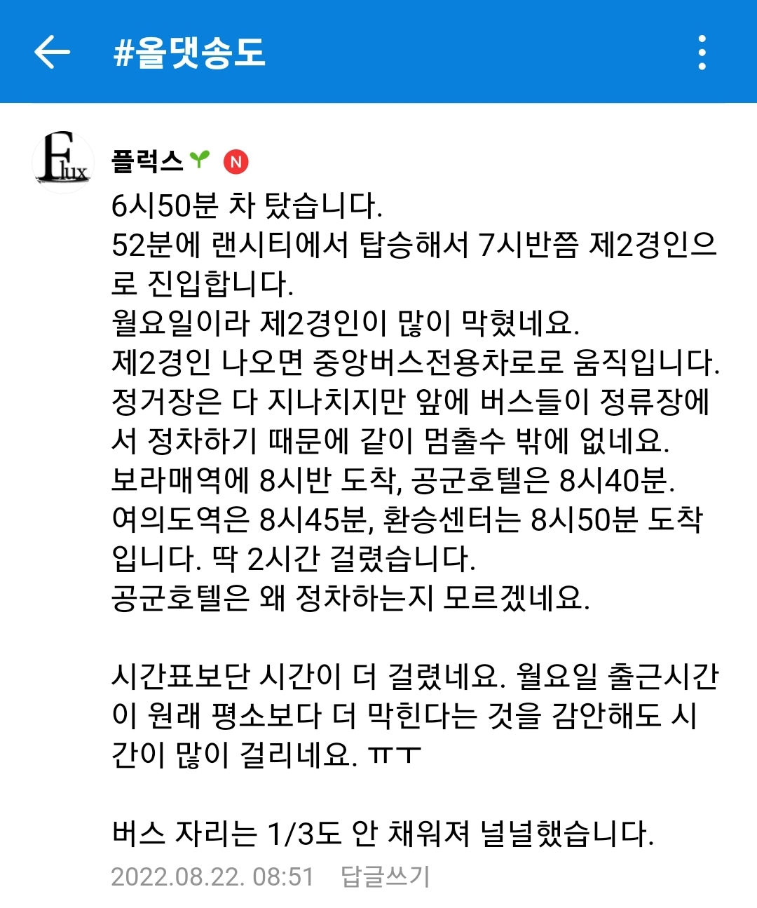 시간표보단 시간이 더 걸렸네요. 월요일 출근시간이 원래 평소보다 더 막힌다는 것을 감안해도 시간이 많이 걸리네요. ㅠㅜ