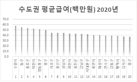 수도권에서 1위는 수원시인데 연봉을 많이 주는 삼성전자 등의 영향으로 생각된다.