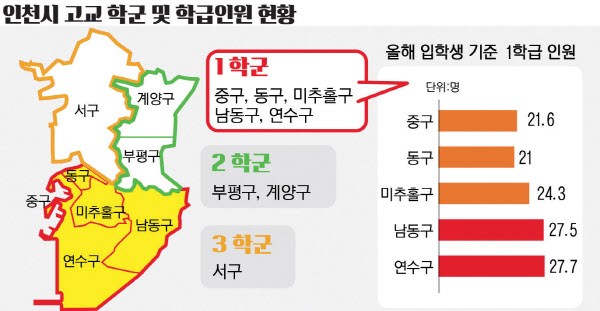 인천은 3개의 공동학교군(1·2공동학교군, 2·3공동학교군, 1·2·3공동학교군) 등 총 6개로 나뉘어 있음.