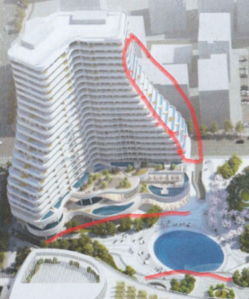 모던한 형태로 다니엘 리벤스킨트가 설계. 뒤에보이는 빌딩 두개가 오피스텔