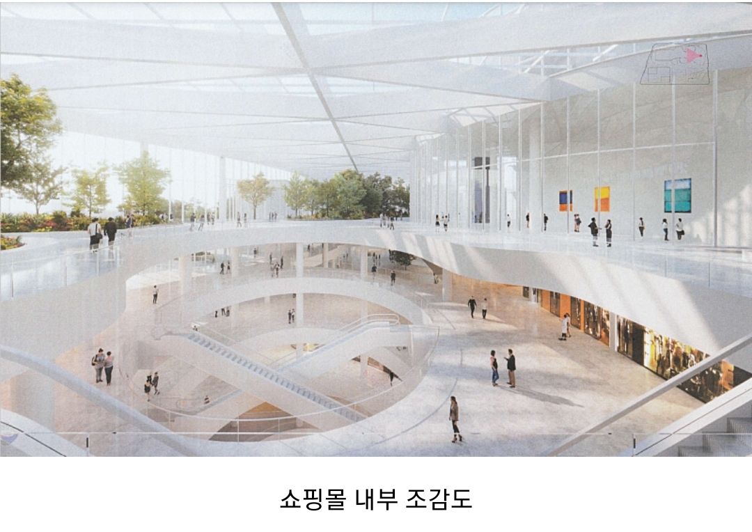 판매시설은 리조트형 쇼핑몰이라는 콘셉트에 맞게 자연 친화 녹지공간과 어우러진 백화점형 몰 형태로 구성된다.