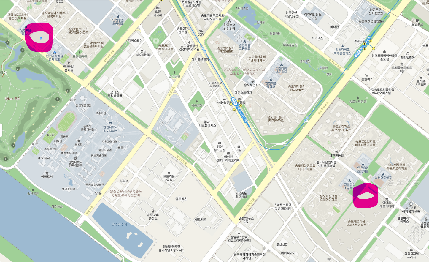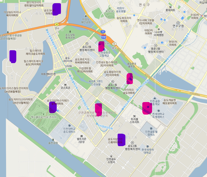 붉은색은 일반고등학교 위치, 보라색은 신설 부지 위치. 전체적으로 송도 내에서도 연식이 있는 공구에 고등학교가 있고 신축 위주의 공구에는 아직 고등학교가 없다.