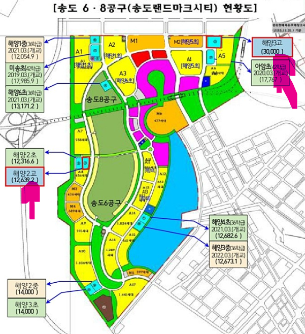 내년에 입주 계획인구 1만 5000명, 5년 내 입주 계획인구 6만명. 입주 연령층이 30대에서 50대가 주를 이루는 송도이니 학교가 얼마나 부족한지 알 수 있을 겁니다.