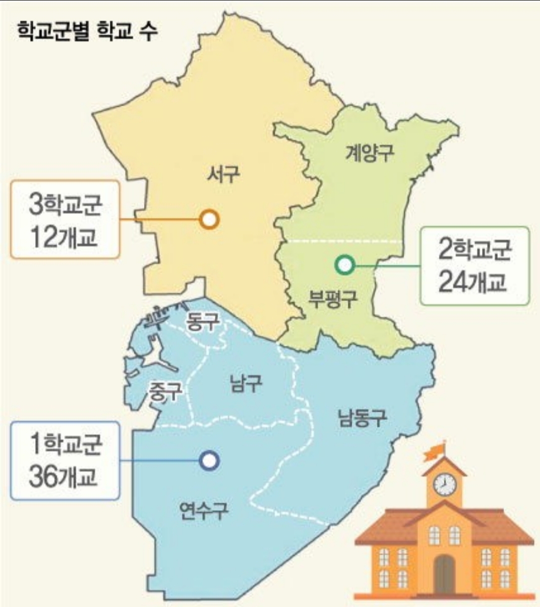 송도가 연수구에 속해있고 학교군으로 치면 1학교군인데 중구. 동구. 미추홀, 남동구 모두 포함이라