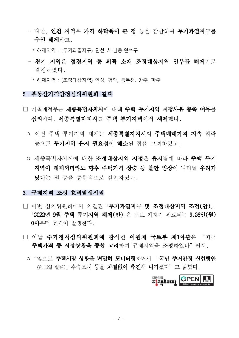투기과열지구 및 조정지역해제(20220926)에 대한 국토부 입장