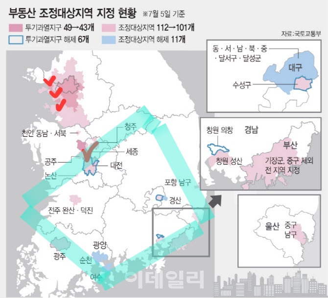 세종과 인천 일부 지역은 투기과열지구에서 해제되지만, 집값 불안 우려가 여전해 조정대상지역은 유지된다.