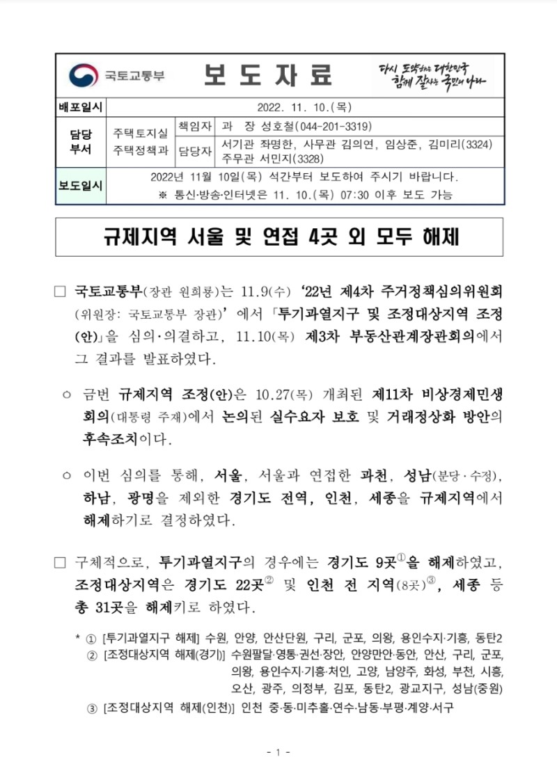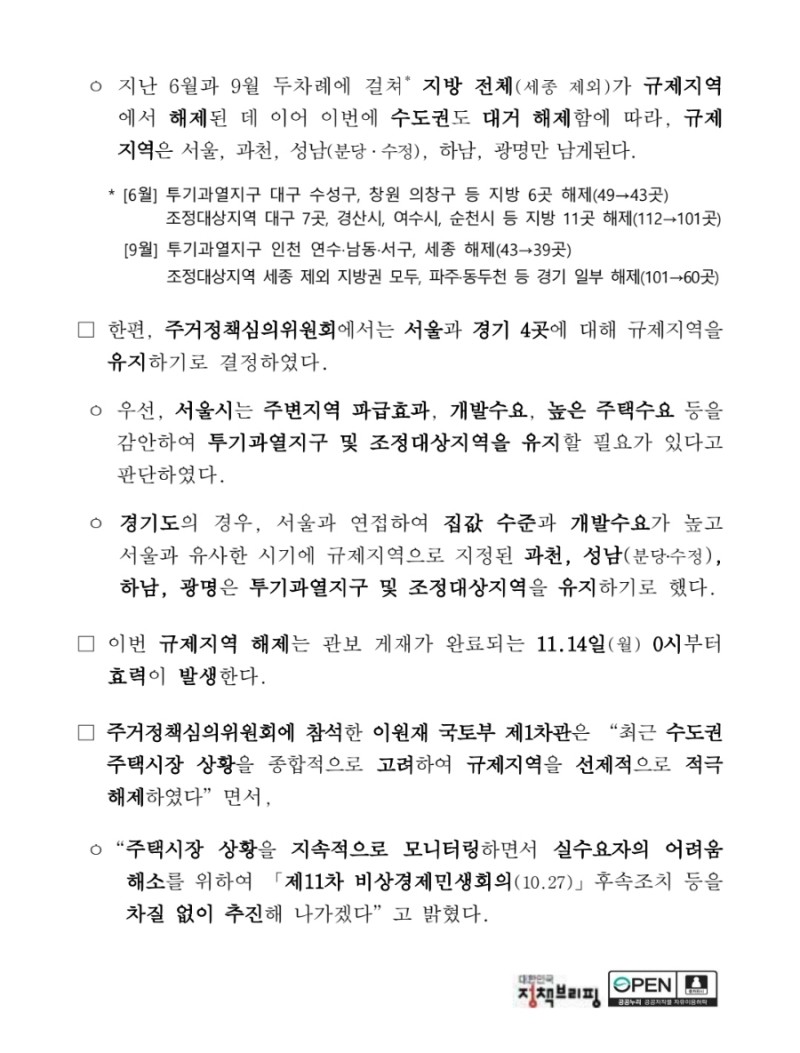 규제지역 서울 및 연접 4곳 외 모두 해제 보도자료