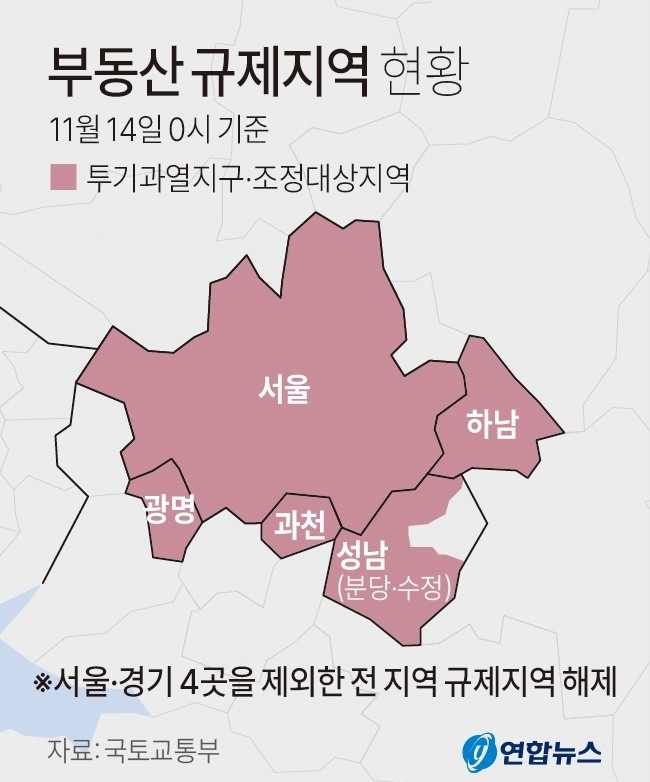 ㅇ 지난 6월과 9월 두차례에 걸쳐* 지방 전체(세종 제외)가 규제지역에서 해제된 데 이어 이번에 수도권도 대거 해제함에 따라, 규제지역은 서울, 과천, 성남(분당·수정), 하남, 광명만 남게된다.