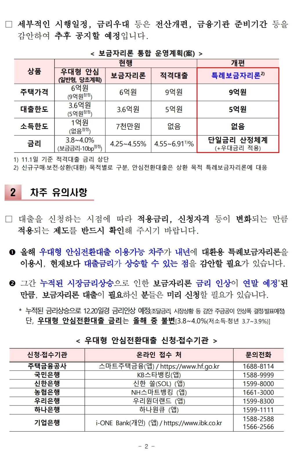 1) 11.1일 기준 적격대출 금리 상단2) 신규구매·보전·상환(대환) 목적별로 구분, 안심전환대출은 상환 목적 특례보금자리론에 대응