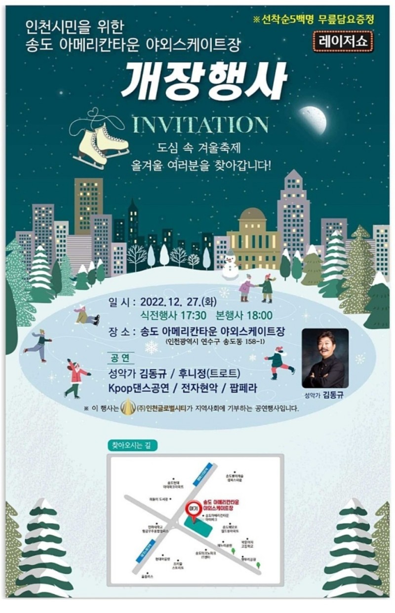 특히 이번 야외스케이트장 조성은 ㈜인천글로벌시티가 지역사회 공헌의 일환으로 마련한 행사로, 시민 안전을 위해 방역수칙 수준을 최대로 끌어올리고 안전사고에도 철저히 대비한다는 방침이다.