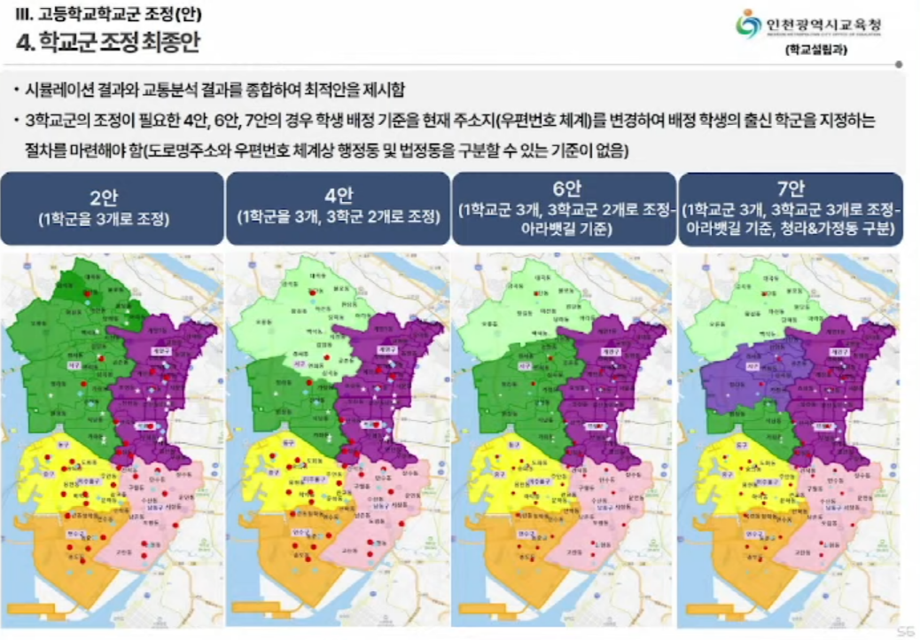 용역결과에서 최적으로 제시된 4개안 모두 연수구를 단독학군(4학군)으로 분리하는 결론입니다.