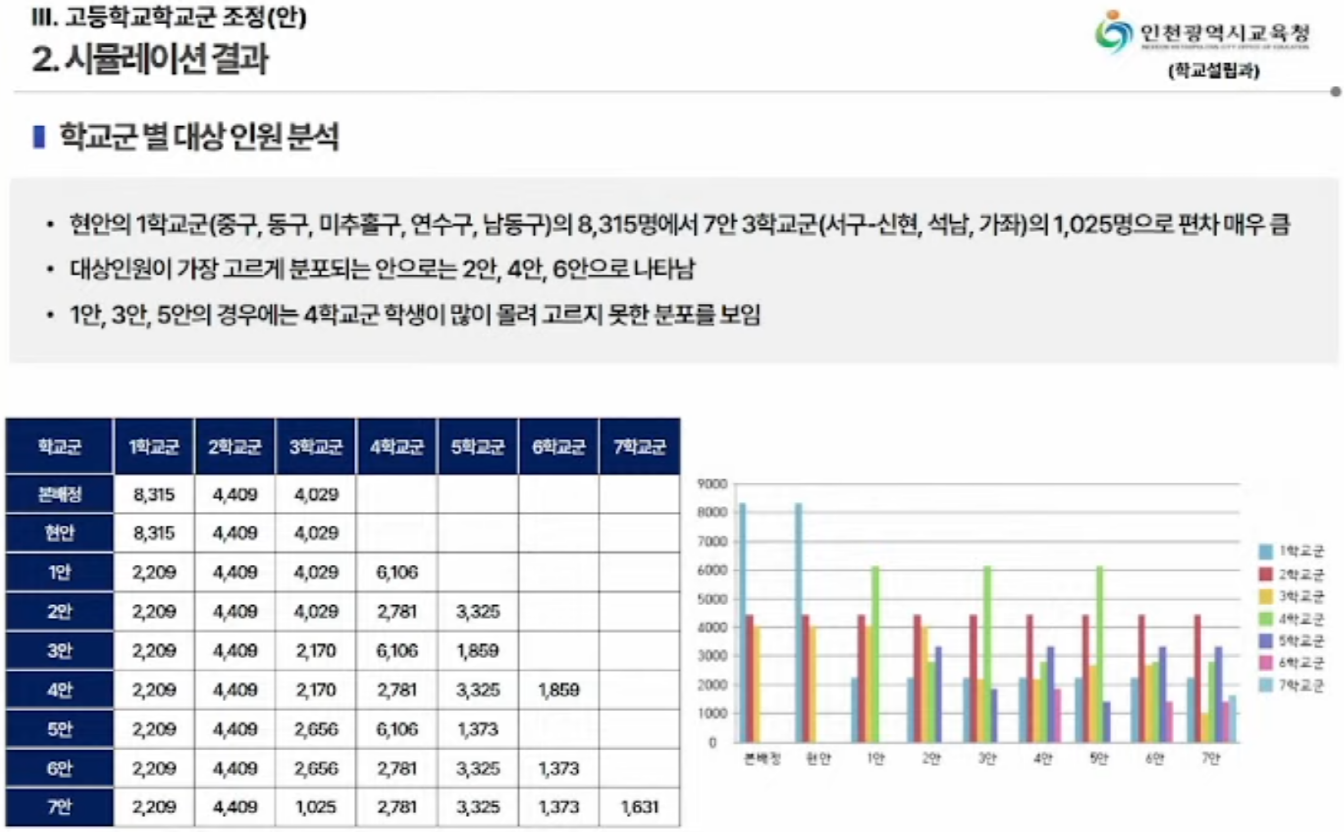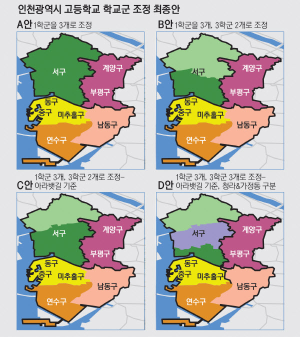 미추홀구, 연수구, 남동구, 서구는 대규모 분양이 남아 있는 곳으로 고등학교 신설 요구가 많을 것으로 예상되는데 1학군 미추홀구는 대부분 학생이 중구나 동구로 배정받을 것으로 보인다.