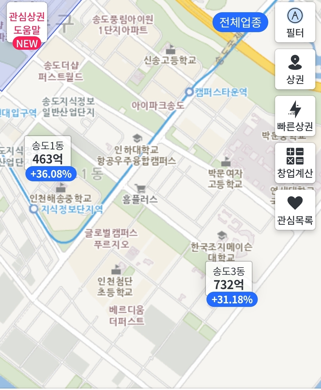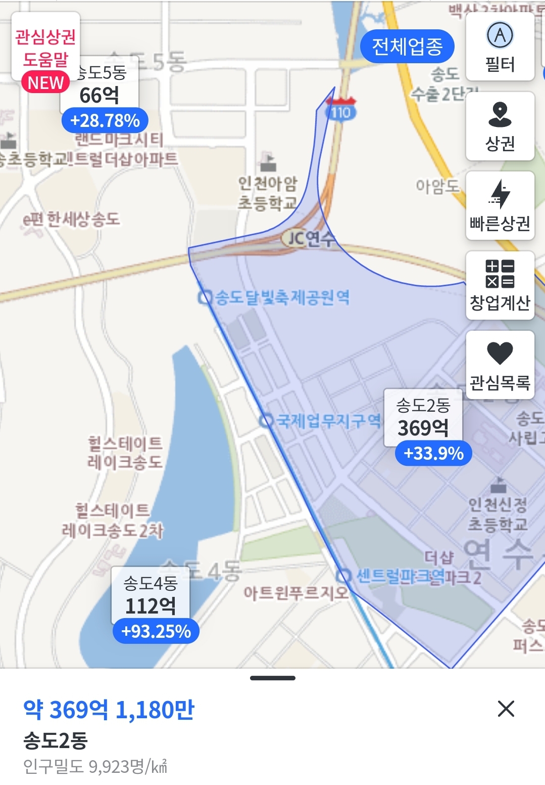 송도2동 369억 (1공구 학원, 병원 등 종합상권)