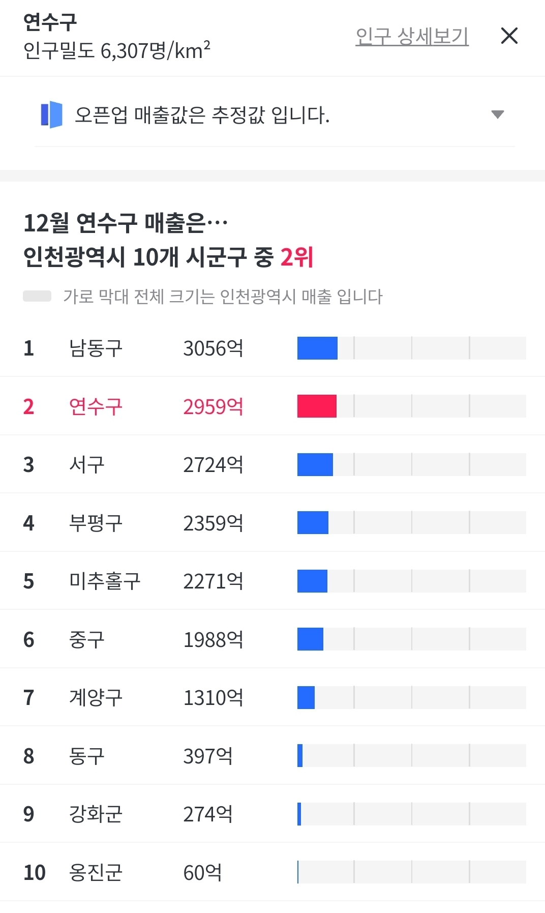 연수구가 상승률 상위권에 있는데 매출규모는 어는정도인지 궁금해서 찾아봤습니다.