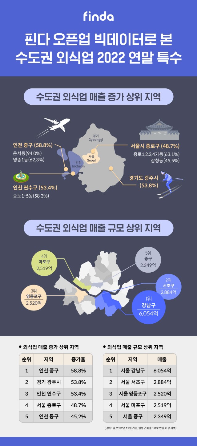 대출 전문 빅데이터 핀테크 기업 핀다가 상권 분석 플랫폼 오픈업을 통해 '2022년 연말 수도권 외식업 상권 데이터'를 26일 공개했다. 이번 데이터는 수도권(서울·경기·인천) 외식업 월평균 매출