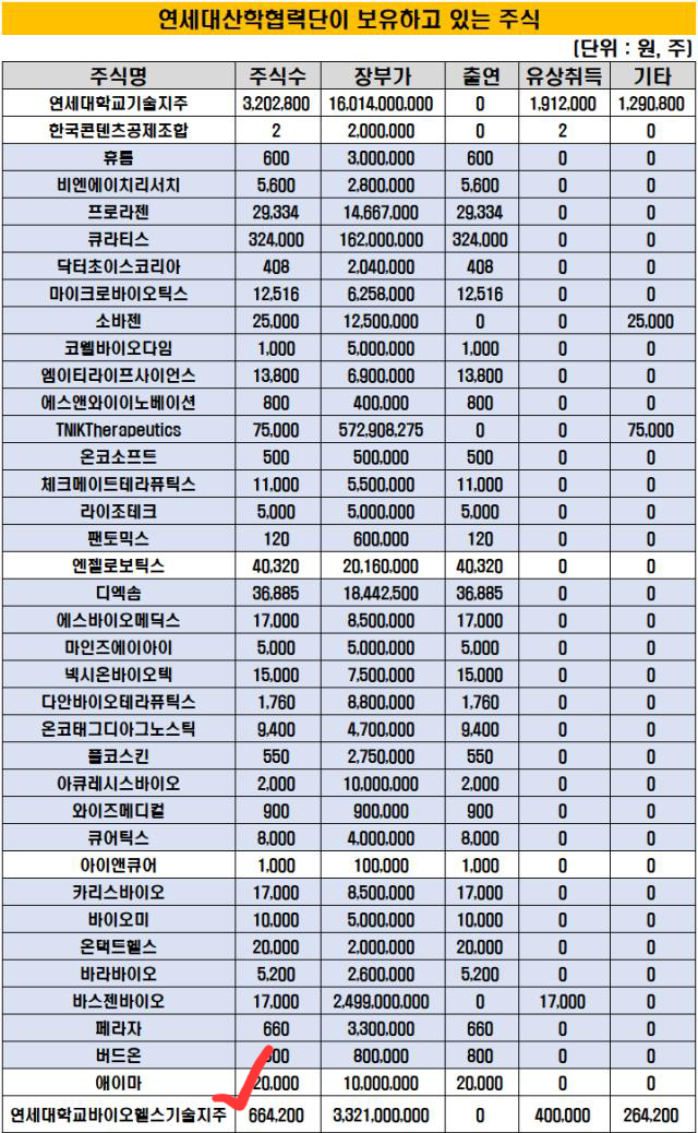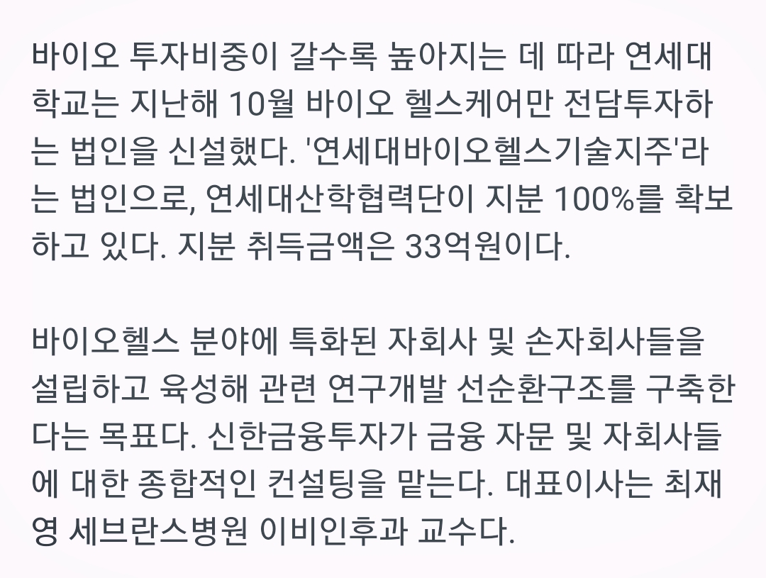 연세대는 공익목적의 산학협력단을 만들고 협력단 산하에 '연세기술지주'를 2011년 설립해서 기업에 지분투자 등을 했는데 바이오 비중이 높아지자 '바이오헬스기술지주'를 별도로 설립하게 된 것으로 보임.