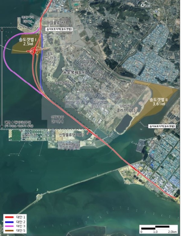 습지보호를 요구하는 환경단체 때문에 대안3과 같은 이상하게 꺾인 노선도 후보에 올랐었다. 다행히 람사르 습지 지정한 인천시에서 습지를 통과해도 된다는 승인을 했기에 대안3은 폐기. 해안선에서 1km이격 할 때마다 공사비 700억 추가 (파란색 대안2는 아파트 앞 해안가로 붙여서 지하화하는 노선)