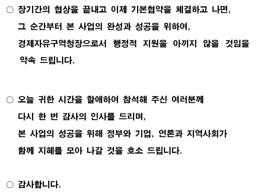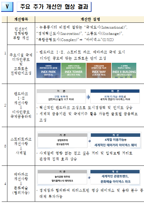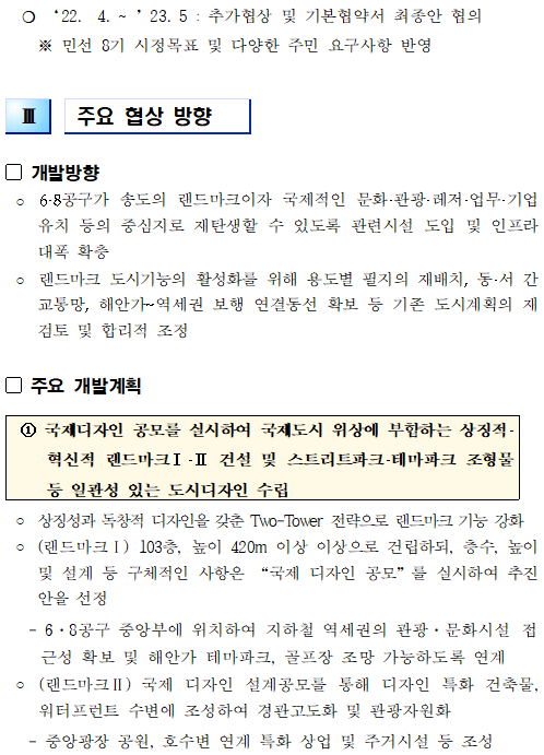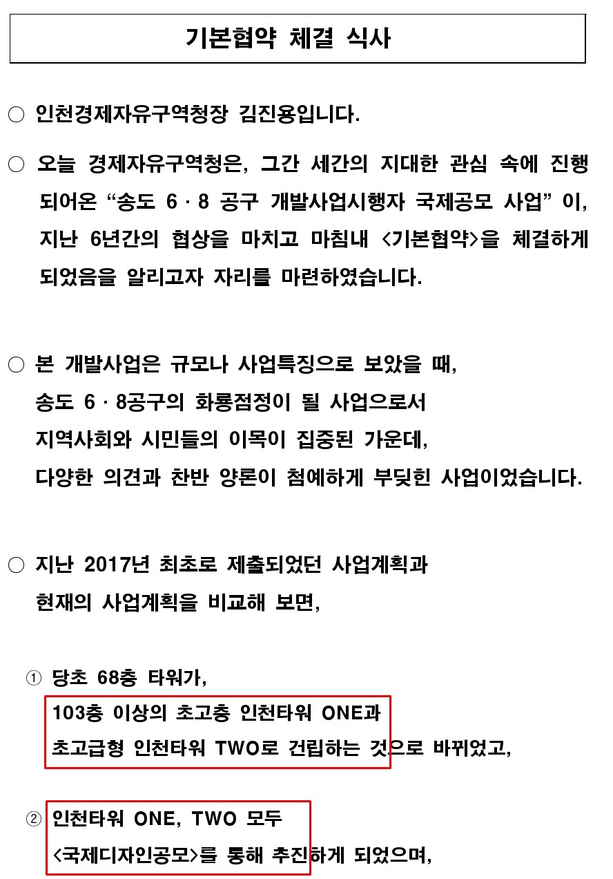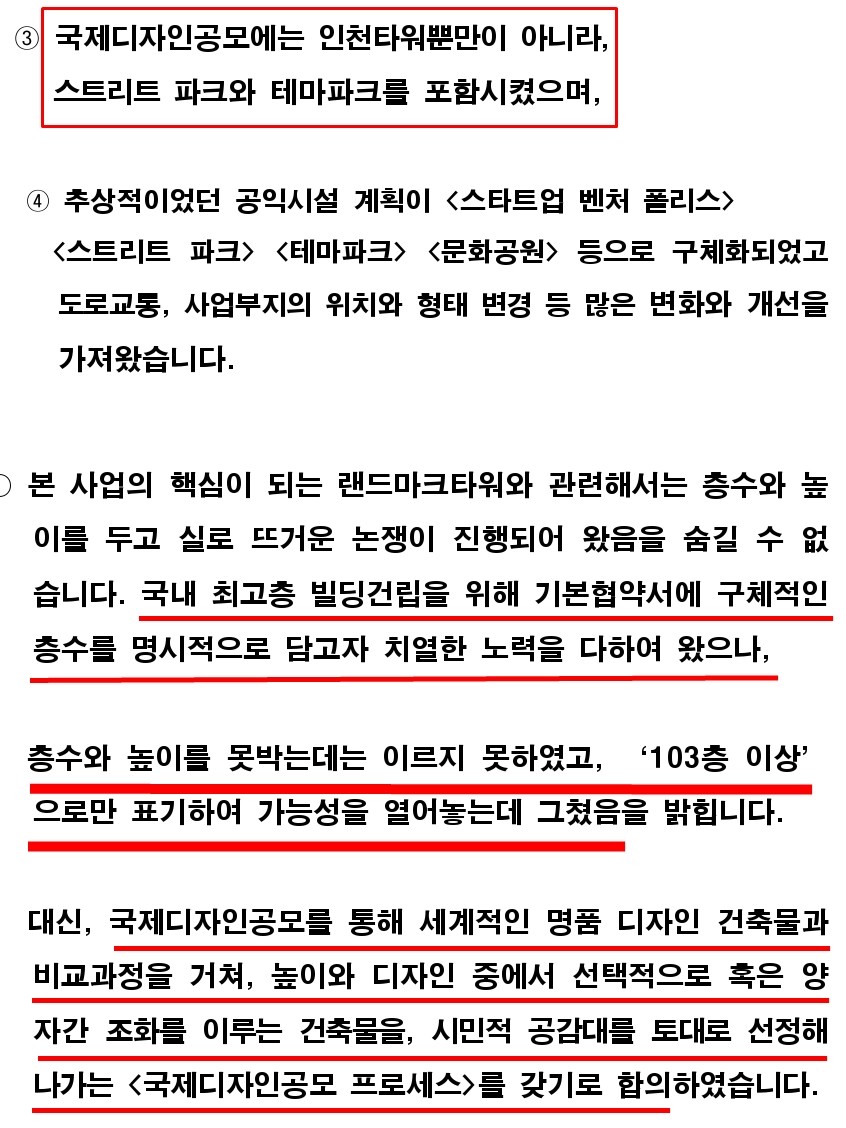 기존과 크게 달라진 내용이 없다보니 사업자에게 유리한 결과라 생각되나 인천타워 103층과 국제공모 같은 코어 프로젝트도 지켜질지 의문이다.