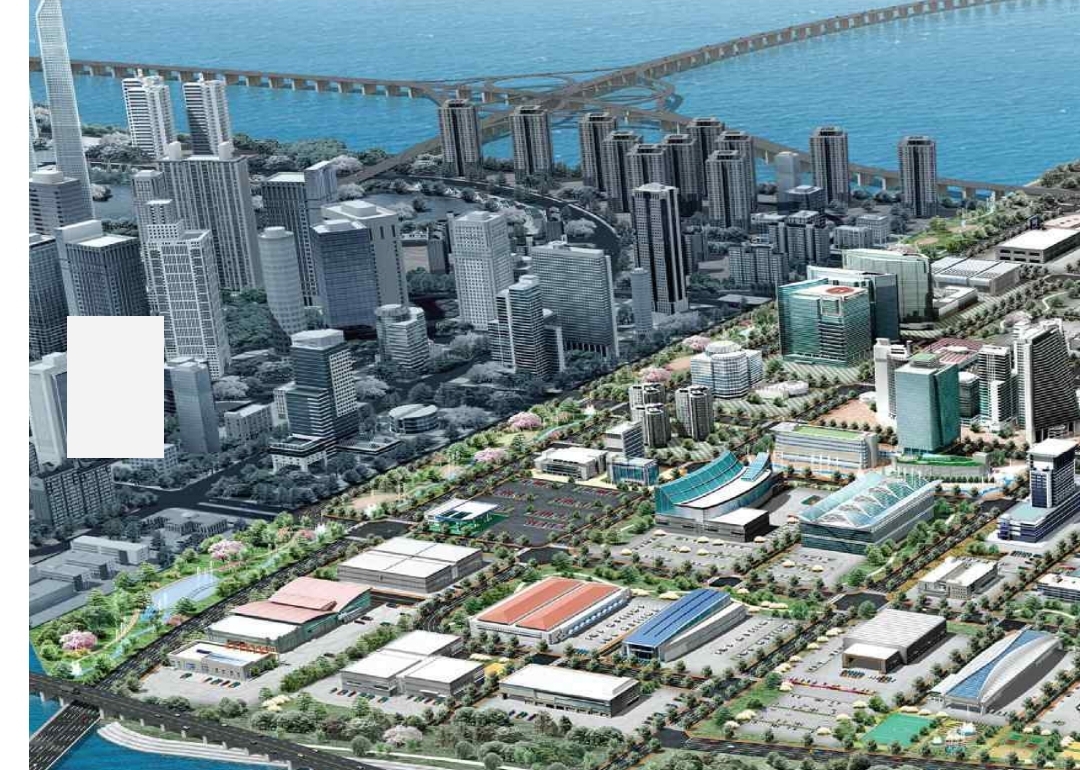 오른쪽 잔디광장은 넓고 좋은데 '주상복합'이라고 표시된 흰색 부분은 항운연안 아파트 이주예정지 이다.