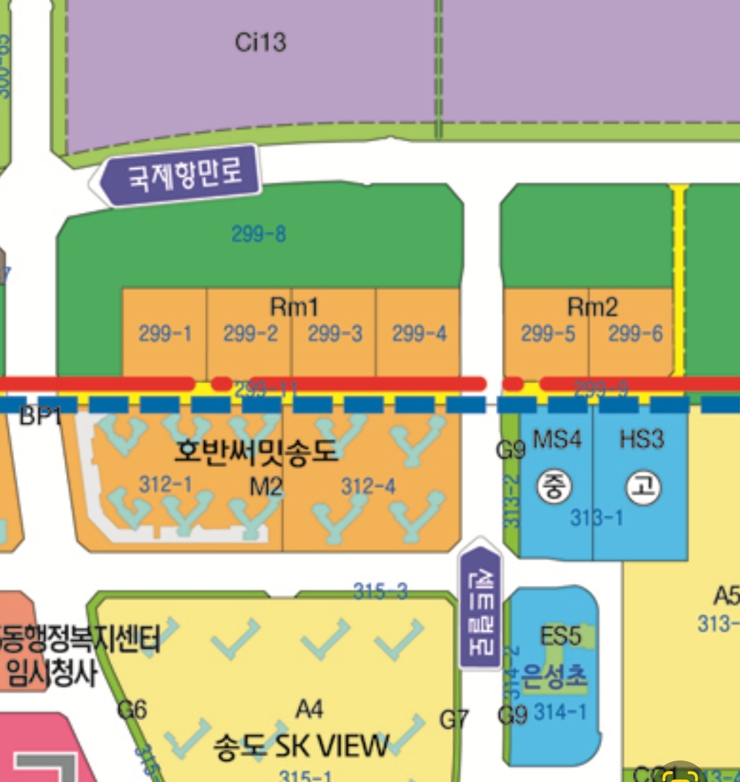 아래 붉은색 표시 구역이 완충녹지이다. 호반 써밋 뒤 2단계 일부는 항운연안아파트가 이주해오면서 바뀔 예정