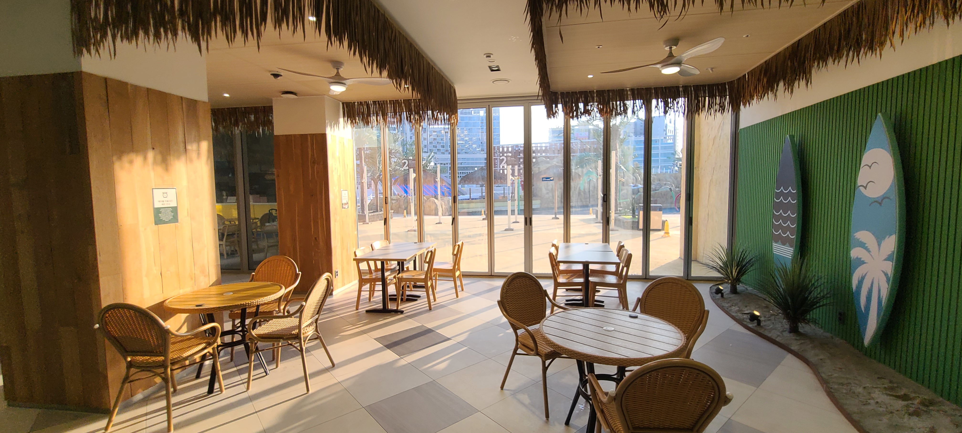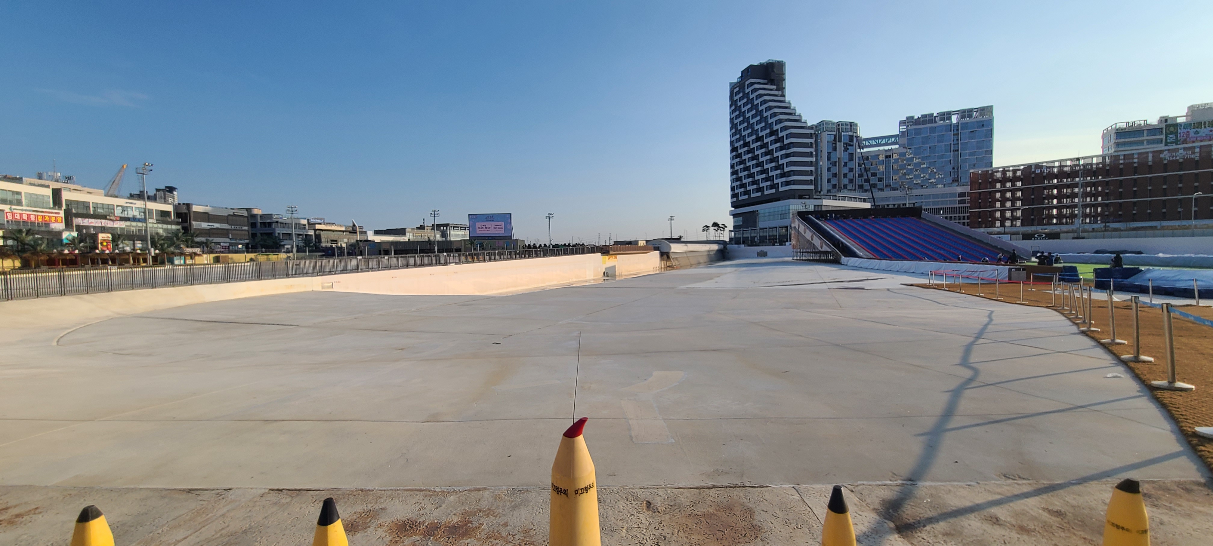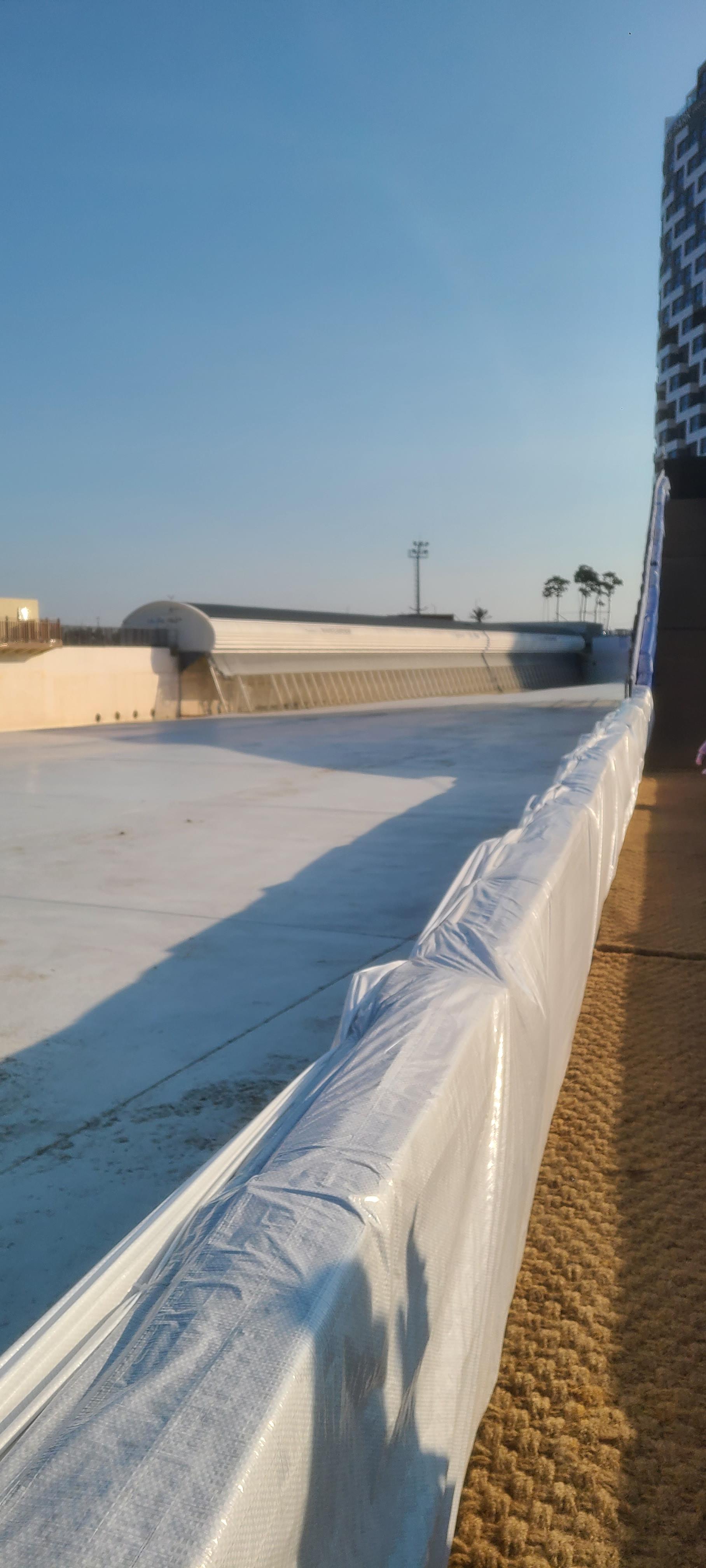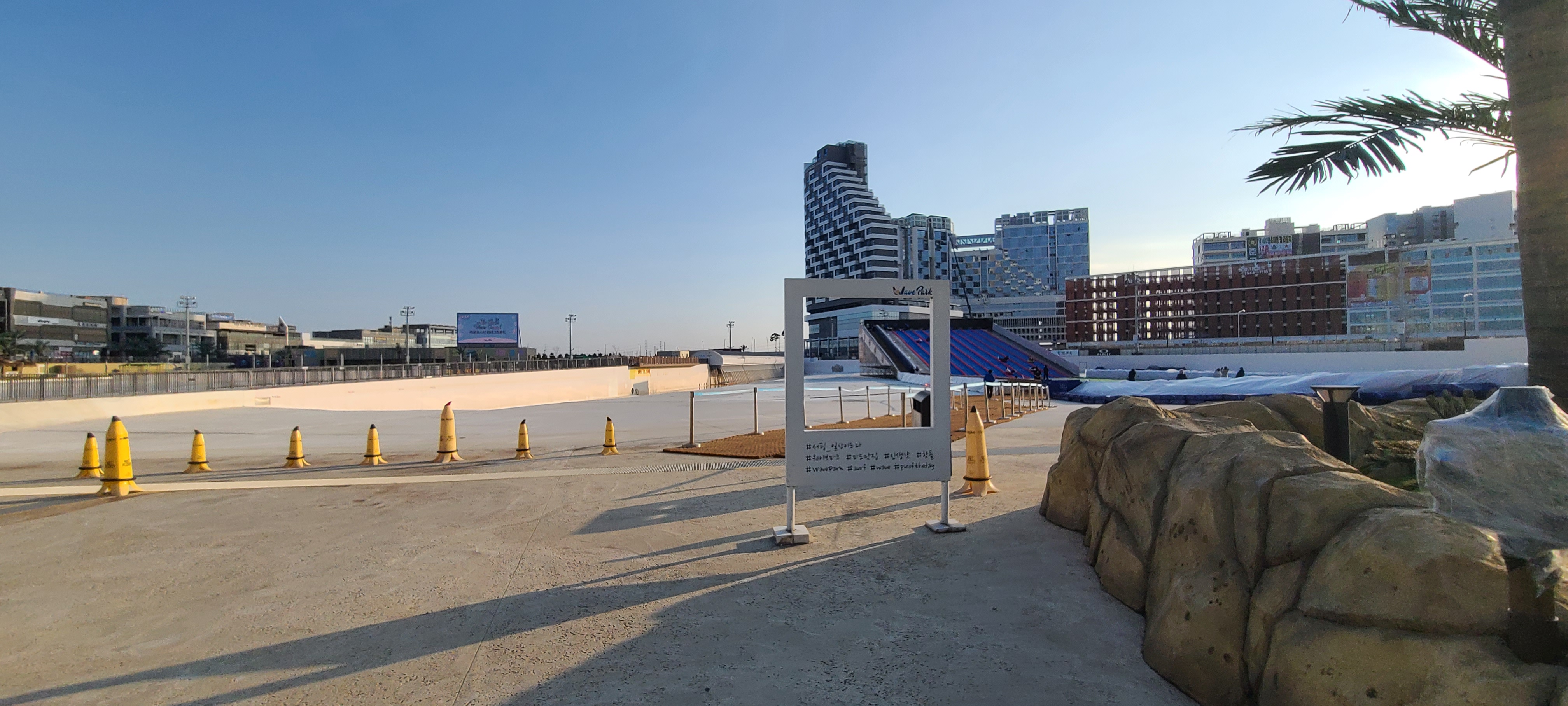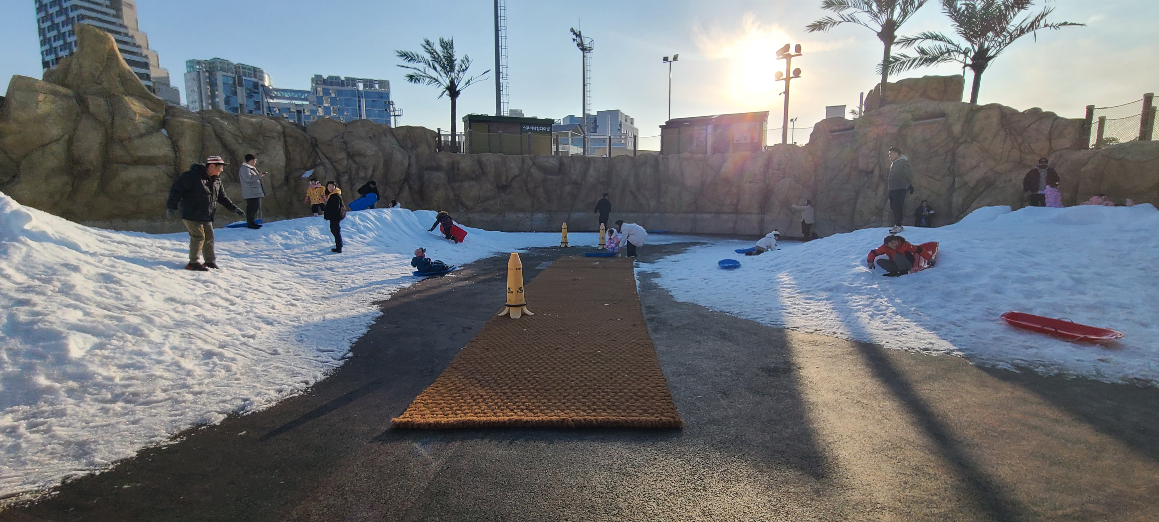 파도풀 서핑장소에 임시구조물로 썰매장 만들어놓음
