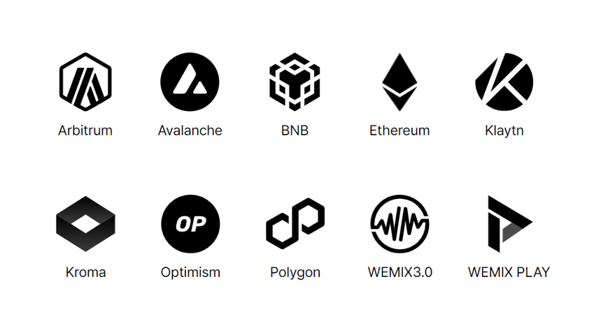 - 서비스 오픈과 함께 WEMIX3.0을 비롯하여, Avalanche, BNB, Ethereum, Kroma, 그리고 Polygon 등(알파벳 순서) 총 6개의 체인을 지원합니다.