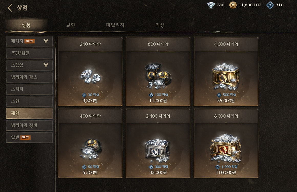 240다이아가 3,300원, 4,000 다이아가 55,000원, 8,000다이아가 110,000원 정도의 가격입니다