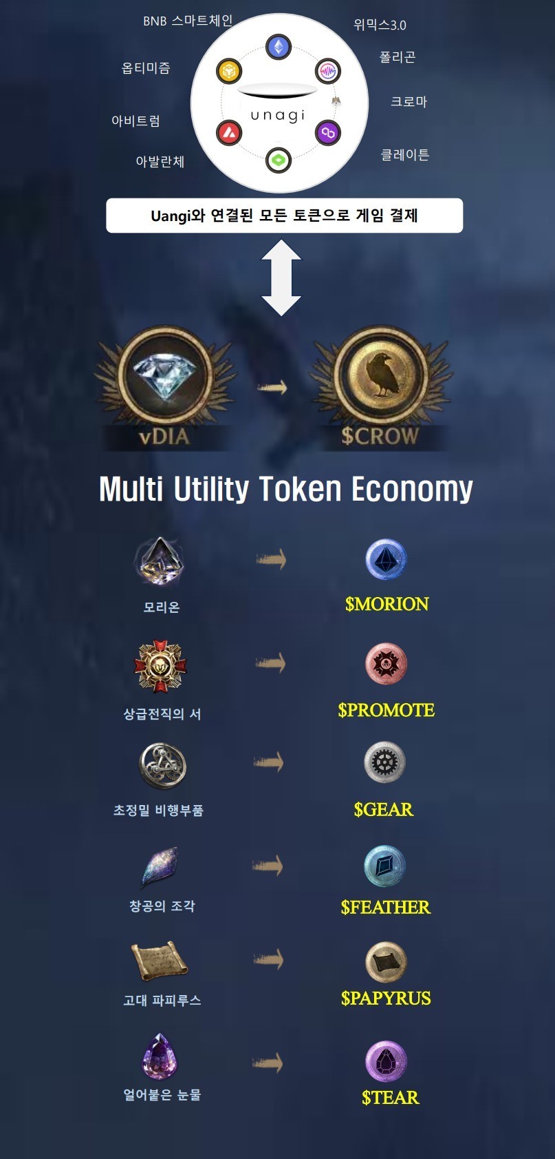 - 나이트크로우의 토큰은 네이티브 토큰 형태로 각 체인에 발행되거나 브릿징되어 효용성과 안전성을 높입니다.