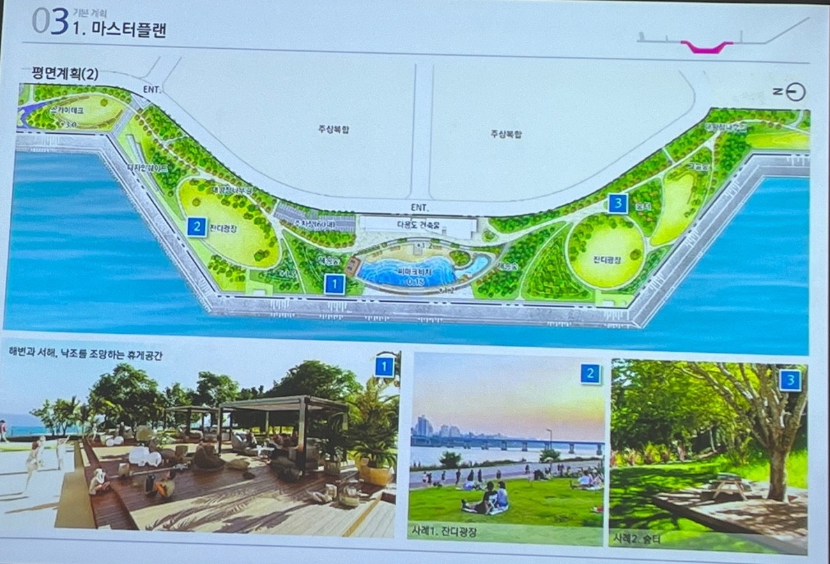 씨마크비치에는 나무가 많아보이고 그늘막 설치 등으로 단점을 보완했으며 인공해변은 4계절, 주야간 이용가능하도록 조명 및 수심조절도 가능하다고 한다.