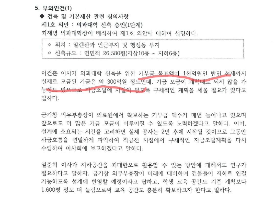 신촌세브란스 의과대학은 기부금받아서 지을예정이고 아직 진행되는거 없으므로 역시 '건설중인 자산취득'에 해당되지 않는다.
